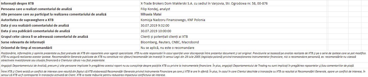"Acest material este o comunicare de marketing în sensul articolului 24 alineatul (3) din Directiva 2014/65 / UE a Parlamentului European și a Consiliului din 15 mai 2014 privind piețele de instrumente financiare, și de modificare a Directivei 2002/92 / CE și a Directivei 2011 / 61 / UE (MiFID II). Comunicarea de marketing nu este o recomandare de investiții sau o recomandare de informații sau o recomandare care sugerează o strategie de investiții în sensul Regulamentului (UE) nr. 596/2014 al Parlamentului European și al Consiliului din 16 aprilie 2014 privind abuzul de piață ( reglementarea abuzului de piață) și de abrogare a Directivei 2003/6 / CE a Parlamentului European și a Consiliului și a Directivelor Comisiei 2003/124 / CE, 2003/125 / CE și 2004/72 / CE și a Regulamentului delegat (UE) 2016/958 al Comisiei din 9 596/2014 al Parlamentului European și al Consiliului în ceea ce privește standardele tehnice de reglementare pentru aranjamentele tehnice pentru prezentarea obiectivă a recomandărilor de investiții sau a altor informații care sugerează strategii de investiții și pentru dezvăluirea de interese particulare sau indicații de conflicte de interese sau orice alte sfaturi, inclusiv în domeniul consultanței în materie de investiții, în sensul Legii privind tranzacționarea cu instrumente financiare din 29 iulie 2005 (de ex. Journal of Laws 2019, articolul 875, astfel cum a fost modificat). Comunicarea de marketing este pregătită cu cea mai mare diligență, obiectivitate, prezintă faptele cunoscute autorului la data pregătirii și este lipsită de orice elemente de evaluare. Comunicarea de marketing este pregătită fără a lua în considerare nevoile clientului, situația sa financiară individuală și nu prezintă nicio strategie de investiții în niciun fel. Comunicarea de marketing nu constituie o ofertă de vânzare, oferire, abonament, invitație la cumpărare, reclamă sau promovare a oricărui instrument financiar. XTB SA nu este responsabilă pentru acțiunile sau omisiunile niciunui client, în special pentru achiziționarea sau cedarea instrumente, întreprinse pe baza informațiilor conținute în această comunicare de marketing. XTB SA nu va accepta răspunderea pentru nicio pierdere sau daună, inclusiv, fără limitare, orice pierdere care poate apărea direct sau indirect, efectuată pe baza informațiilor conținute în această comunicare de marketing. În cazul în care comunicarea de marketing conține informații despre orice rezultat cu privire la instrumentele financiare indicate în acestea, acestea nu constituie nicio garanție sau prognoză cu privire la rezultatele viitoare. Performanțele anterioare nu indică neapărat rezultatele viitoare și orice persoană care acționează pe baza acestor informații o face pe propriul risc. Acest material nu este emis pentru a influenta deciziile de tranzacționare ale niciunei persoane. Informațiile cuprinse în cadrul acestui material nu sunt prezentate pentru a fi aplicate, copiate sau testate în cadrul tranzacțiilor dumneavoastră. Informațiile cuprinse în cadrul acestui material sunt emise în baza experienței proprii a emitentului și nu reprezintă o recomandare individuală, nu vizează atingerea anumitor obiective, randamente financiare și nu se adresează nevoilor niciunei persoane anume care ar primi-o. Premisele acestui material nu au în vedere situația și persoana dumneavoastră deci nu recomandăm utilizarea acestor informații sub orice formă. Utilizarea informațiilor cuprinse în cadrul acestui material în orice modalitate se face pe propria dumneavoastră răspundere. Acest material este emis de către un analist pentru care își asumă răspunderea XTB SA, persoană juridică autorizată de KNF – Autoritatea de Supraveghere Financiara din Polonia."