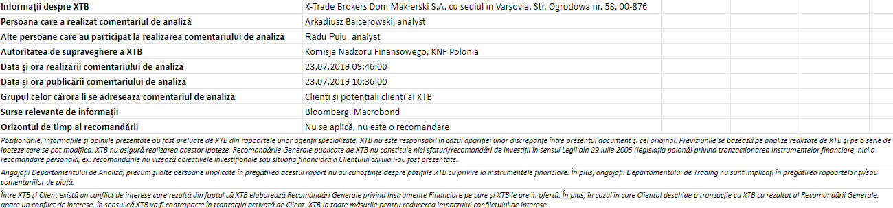 "Acest material este o comunicare de marketing în sensul articolului 24 alineatul (3) din Directiva 2014/65 / UE a Parlamentului European și a Consiliului din 15 mai 2014 privind piețele de instrumente financiare, și de modificare a Directivei 2002/92 / CE și a Directivei 2011 / 61 / UE (MiFID II). Comunicarea de marketing nu este o recomandare de investiții sau o recomandare de informații sau o recomandare care sugerează o strategie de investiții în sensul Regulamentului (UE) nr. 596/2014 al Parlamentului European și al Consiliului din 16 aprilie 2014 privind abuzul de piață ( reglementarea abuzului de piață) și de abrogare a Directivei 2003/6 / CE a Parlamentului European și a Consiliului și a Directivelor Comisiei 2003/124 / CE, 2003/125 / CE și 2004/72 / CE și a Regulamentului delegat (UE) 2016/958 al Comisiei din 9 596/2014 al Parlamentului European și al Consiliului în ceea ce privește standardele tehnice de reglementare pentru aranjamentele tehnice pentru prezentarea obiectivă a recomandărilor de investiții sau a altor informații care sugerează strategii de investiții și pentru dezvăluirea de interese particulare sau indicații de conflicte de interese sau orice alte sfaturi, inclusiv în domeniul consultanței în materie de investiții, în sensul Legii privind tranzacționarea cu instrumente financiare din 29 iulie 2005 (de ex. Journal of Laws 2019, articolul 875, astfel cum a fost modificat). Comunicarea de marketing este pregătită cu cea mai mare diligență, obiectivitate, prezintă faptele cunoscute autorului la data pregătirii și este lipsită de orice elemente de evaluare. Comunicarea de marketing este pregătită fără a lua în considerare nevoile clientului, situația sa financiară individuală și nu prezintă nicio strategie de investiții în niciun fel. Comunicarea de marketing nu constituie o ofertă de vânzare, oferire, abonament, invitație la cumpărare, reclamă sau promovare a oricărui instrument financiar. XTB SA nu este responsabilă pentru acțiunile sau omisiunile niciunui client, în special pentru achiziționarea sau cedarea instrumente, întreprinse pe baza informațiilor conținute în această comunicare de marketing. XTB SA nu va accepta răspunderea pentru nicio pierdere sau daună, inclusiv, fără limitare, orice pierdere care poate apărea direct sau indirect, efectuată pe baza informațiilor conținute în această comunicare de marketing. În cazul în care comunicarea de marketing conține informații despre orice rezultat cu privire la instrumentele financiare indicate în acestea, acestea nu constituie nicio garanție sau prognoză cu privire la rezultatele viitoare. Performanțele anterioare nu indică neapărat rezultatele viitoare și orice persoană care acționează pe baza acestor informații o face pe propriul risc. Acest material nu este emis pentru a influenta deciziile de tranzacționare ale niciunei persoane. Informațiile cuprinse în cadrul acestui material nu sunt prezentate pentru a fi aplicate, copiate sau testate în cadrul tranzacțiilor dumneavoastră. Informațiile cuprinse în cadrul acestui material sunt emise în baza experienței proprii a emitentului și nu reprezintă o recomandare individuală, nu vizează atingerea anumitor obiective, randamente financiare și nu se adresează nevoilor niciunei persoane anume care ar primi-o. Premisele acestui material nu au în vedere situația și persoana dumneavoastră deci nu recomandăm utilizarea acestor informații sub orice formă. Utilizarea informațiilor cuprinse în cadrul acestui material în orice modalitate se face pe propria dumneavoastră răspundere. Acest material este emis de către un analist pentru care își asumă răspunderea XTB SA, persoană juridică autorizată de KNF – Autoritatea de Supraveghere Financiara din Polonia."