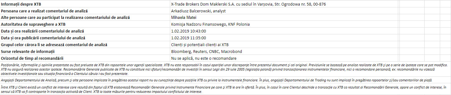 "Acest material este o comunicare de marketing în sensul articolului 24 alineatul (3) din Directiva 2014/65 / UE a Parlamentului European și a Consiliului din 15 mai 2014 privind piețele de instrumente financiare, și de modificare a Directivei 2002/92 / CE și a Directivei 2011 / 61 / UE (MiFID II). Comunicarea de marketing nu este o recomandare de investiții sau o recomandare de informații sau o recomandare care sugerează o strategie de investiții în sensul Regulamentului (UE) nr. 596/2014 al Parlamentului European și al Consiliului din 16 aprilie 2014 privind abuzul de piață ( reglementarea abuzului de piață) și de abrogare a Directivei 2003/6 / CE a Parlamentului European și a Consiliului și a Directivelor Comisiei 2003/124 / CE, 2003/125 / CE și 2004/72 / CE și a Regulamentului delegat (UE) 2016/958 al Comisiei din 9 596/2014 al Parlamentului European și al Consiliului în ceea ce privește standardele tehnice de reglementare pentru aranjamentele tehnice pentru prezentarea obiectivă a recomandărilor de investiții sau a altor informații care sugerează strategii de investiții și pentru dezvăluirea de interese particulare sau indicații de conflicte de interese sau orice alte sfaturi, inclusiv în domeniul consultanței în materie de investiții, în sensul Legii privind tranzacționarea cu instrumente financiare din 29 iulie 2005 (de ex. Journal of Laws 2019, articolul 875, astfel cum a fost modificat). Comunicarea de marketing este pregătită cu cea mai mare diligență, obiectivitate, prezintă faptele cunoscute autorului la data pregătirii și este lipsită de orice elemente de evaluare. Comunicarea de marketing este pregătită fără a lua în considerare nevoile clientului, situația sa financiară individuală și nu prezintă nicio strategie de investiții în niciun fel. Comunicarea de marketing nu constituie o ofertă de vânzare, oferire, abonament, invitație la cumpărare, reclamă sau promovare a oricărui instrument financiar. XTB SA nu este responsabilă pentru acțiunile sau omisiunile niciunui client, în special pentru achiziționarea sau cedarea instrumente, întreprinse pe baza informațiilor conținute în această comunicare de marketing. XTB SA nu va accepta răspunderea pentru nicio pierdere sau daună, inclusiv, fără limitare, orice pierdere care poate apărea direct sau indirect, efectuată pe baza informațiilor conținute în această comunicare de marketing. În cazul în care comunicarea de marketing conține informații despre orice rezultat cu privire la instrumentele financiare indicate în acestea, acestea nu constituie nicio garanție sau prognoză cu privire la rezultatele viitoare. Performanțele anterioare nu indică neapărat rezultatele viitoare și orice persoană care acționează pe baza acestor informații o face pe propriul risc. Acest material nu este emis pentru a influenta deciziile de tranzacționare ale niciunei persoane. Informațiile cuprinse în cadrul acestui material nu sunt prezentate pentru a fi aplicate, copiate sau testate în cadrul tranzacțiilor dumneavoastră. Informațiile cuprinse în cadrul acestui material sunt emise în baza experienței proprii a emitentului și nu reprezintă o recomandare individuală, nu vizează atingerea anumitor obiective, randamente financiare și nu se adresează nevoilor niciunei persoane anume care ar primi-o. Premisele acestui material nu au în vedere situația și persoana dumneavoastră deci nu recomandăm utilizarea acestor informații sub orice formă. Utilizarea informațiilor cuprinse în cadrul acestui material în orice modalitate se face pe propria dumneavoastră răspundere. Acest material este emis de către un analist pentru care își asumă răspunderea XTB SA, persoană juridică autorizată de KNF – Autoritatea de Supraveghere Financiara din Polonia."