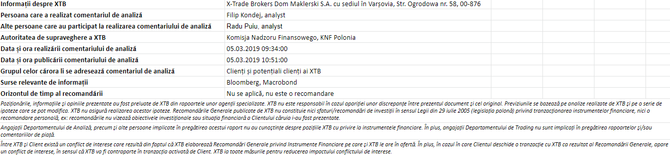 "Acest material este o comunicare de marketing în sensul articolului 24 alineatul (3) din Directiva 2014/65 / UE a Parlamentului European și a Consiliului din 15 mai 2014 privind piețele de instrumente financiare, și de modificare a Directivei 2002/92 / CE și a Directivei 2011 / 61 / UE (MiFID II). Comunicarea de marketing nu este o recomandare de investiții sau o recomandare de informații sau o recomandare care sugerează o strategie de investiții în sensul Regulamentului (UE) nr. 596/2014 al Parlamentului European și al Consiliului din 16 aprilie 2014 privind abuzul de piață ( reglementarea abuzului de piață) și de abrogare a Directivei 2003/6 / CE a Parlamentului European și a Consiliului și a Directivelor Comisiei 2003/124 / CE, 2003/125 / CE și 2004/72 / CE și a Regulamentului delegat (UE) 2016/958 al Comisiei din 9 596/2014 al Parlamentului European și al Consiliului în ceea ce privește standardele tehnice de reglementare pentru aranjamentele tehnice pentru prezentarea obiectivă a recomandărilor de investiții sau a altor informații care sugerează strategii de investiții și pentru dezvăluirea de interese particulare sau indicații de conflicte de interese sau orice alte sfaturi, inclusiv în domeniul consultanței în materie de investiții, în sensul Legii privind tranzacționarea cu instrumente financiare din 29 iulie 2005 (de ex. Journal of Laws 2019, articolul 875, astfel cum a fost modificat). Comunicarea de marketing este pregătită cu cea mai mare diligență, obiectivitate, prezintă faptele cunoscute autorului la data pregătirii și este lipsită de orice elemente de evaluare. Comunicarea de marketing este pregătită fără a lua în considerare nevoile clientului, situația sa financiară individuală și nu prezintă nicio strategie de investiții în niciun fel. Comunicarea de marketing nu constituie o ofertă de vânzare, oferire, abonament, invitație la cumpărare, reclamă sau promovare a oricărui instrument financiar. XTB SA nu este responsabilă pentru acțiunile sau omisiunile niciunui client, în special pentru achiziționarea sau cedarea instrumente, întreprinse pe baza informațiilor conținute în această comunicare de marketing. XTB SA nu va accepta răspunderea pentru nicio pierdere sau daună, inclusiv, fără limitare, orice pierdere care poate apărea direct sau indirect, efectuată pe baza informațiilor conținute în această comunicare de marketing. În cazul în care comunicarea de marketing conține informații despre orice rezultat cu privire la instrumentele financiare indicate în acestea, acestea nu constituie nicio garanție sau prognoză cu privire la rezultatele viitoare. Performanțele anterioare nu indică neapărat rezultatele viitoare și orice persoană care acționează pe baza acestor informații o face pe propriul risc. Acest material nu este emis pentru a influenta deciziile de tranzacționare ale niciunei persoane. Informațiile cuprinse în cadrul acestui material nu sunt prezentate pentru a fi aplicate, copiate sau testate în cadrul tranzacțiilor dumneavoastră. Informațiile cuprinse în cadrul acestui material sunt emise în baza experienței proprii a emitentului și nu reprezintă o recomandare individuală, nu vizează atingerea anumitor obiective, randamente financiare și nu se adresează nevoilor niciunei persoane anume care ar primi-o. Premisele acestui material nu au în vedere situația și persoana dumneavoastră deci nu recomandăm utilizarea acestor informații sub orice formă. Utilizarea informațiilor cuprinse în cadrul acestui material în orice modalitate se face pe propria dumneavoastră răspundere. Acest material este emis de către un analist pentru care își asumă răspunderea XTB SA, persoană juridică autorizată de KNF – Autoritatea de Supraveghere Financiara din Polonia."