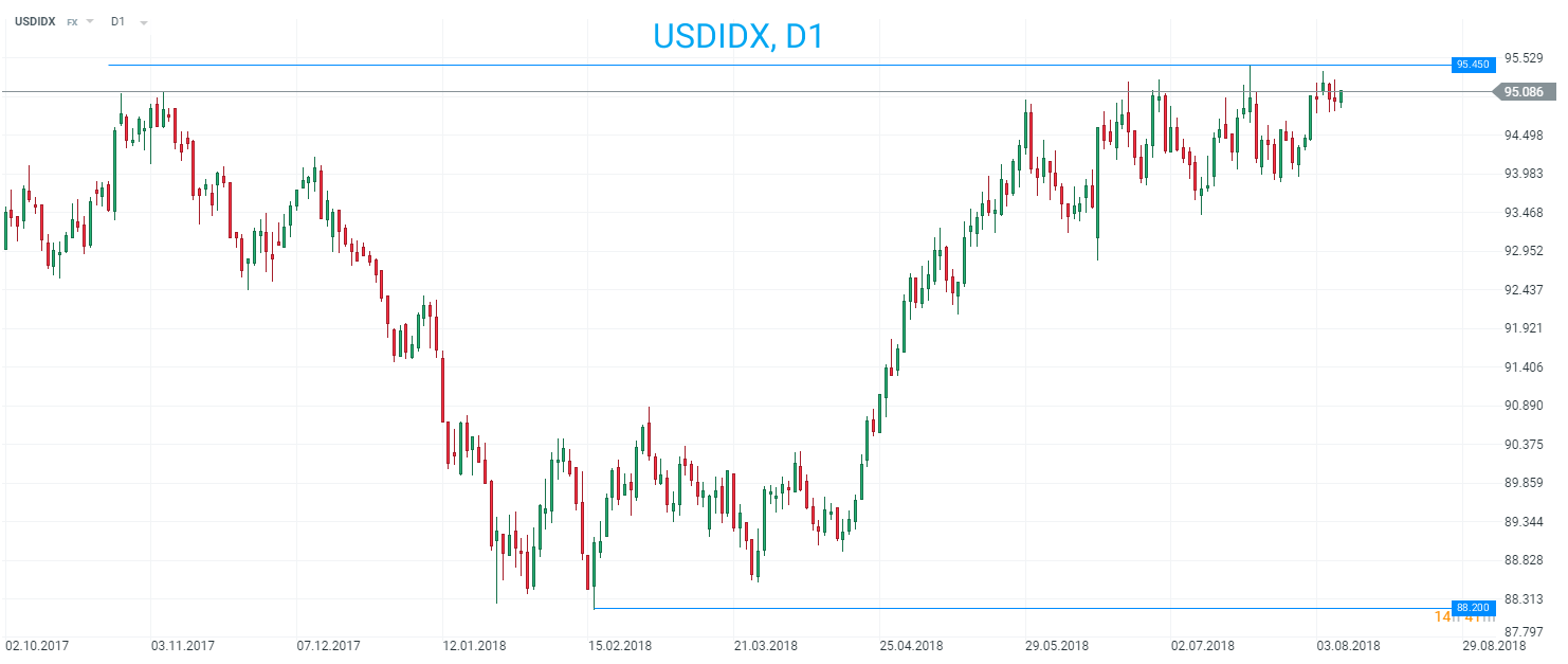 Indicatorul USDIDX a trasat miercuri o posibilă lumânare bearish, prețul întâmpinând în continuare probleme în apropierea nivelului de rezistență de la 95-95,45. Sursa: xStation