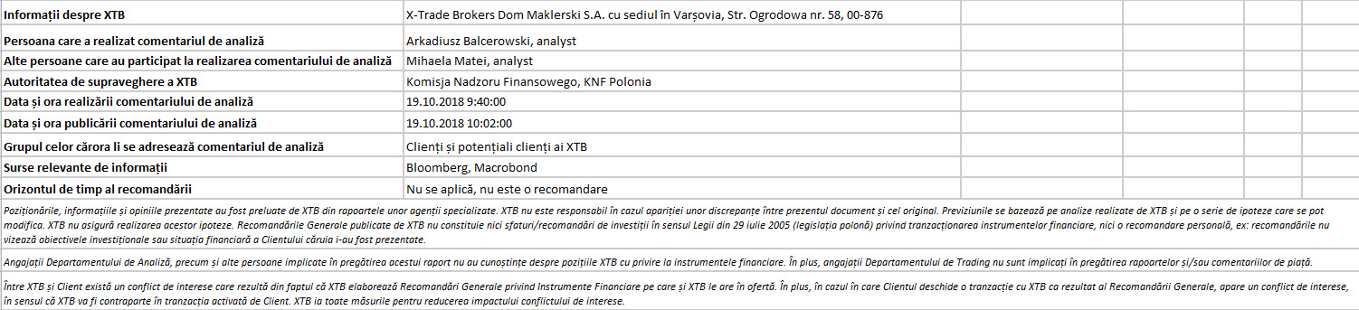"Acest material este o comunicare de marketing în sensul articolului 24 alineatul (3) din Directiva 2014/65 / UE a Parlamentului European și a Consiliului din 15 mai 2014 privind piețele de instrumente financiare, și de modificare a Directivei 2002/92 / CE și a Directivei 2011 / 61 / UE (MiFID II). Comunicarea de marketing nu este o recomandare de investiții sau o recomandare de informații sau o recomandare care sugerează o strategie de investiții în sensul Regulamentului (UE) nr. 596/2014 al Parlamentului European și al Consiliului din 16 aprilie 2014 privind abuzul de piață ( reglementarea abuzului de piață) și de abrogare a Directivei 2003/6 / CE a Parlamentului European și a Consiliului și a Directivelor Comisiei 2003/124 / CE, 2003/125 / CE și 2004/72 / CE și a Regulamentului delegat (UE) 2016/958 al Comisiei din 9 596/2014 al Parlamentului European și al Consiliului în ceea ce privește standardele tehnice de reglementare pentru aranjamentele tehnice pentru prezentarea obiectivă a recomandărilor de investiții sau a altor informații care sugerează strategii de investiții și pentru dezvăluirea de interese particulare sau indicații de conflicte de interese sau orice alte sfaturi, inclusiv în domeniul consultanței în materie de investiții, în sensul Legii privind tranzacționarea cu instrumente financiare din 29 iulie 2005 (de ex. Journal of Laws 2019, articolul 875, astfel cum a fost modificat). Comunicarea de marketing este pregătită cu cea mai mare diligență, obiectivitate, prezintă faptele cunoscute autorului la data pregătirii și este lipsită de orice elemente de evaluare. Comunicarea de marketing este pregătită fără a lua în considerare nevoile clientului, situația sa financiară individuală și nu prezintă nicio strategie de investiții în niciun fel. Comunicarea de marketing nu constituie o ofertă de vânzare, oferire, abonament, invitație la cumpărare, reclamă sau promovare a oricărui instrument financiar. XTB SA nu este responsabilă pentru acțiunile sau omisiunile niciunui client, în special pentru achiziționarea sau cedarea instrumente, întreprinse pe baza informațiilor conținute în această comunicare de marketing. XTB SA nu va accepta răspunderea pentru nicio pierdere sau daună, inclusiv, fără limitare, orice pierdere care poate apărea direct sau indirect, efectuată pe baza informațiilor conținute în această comunicare de marketing. În cazul în care comunicarea de marketing conține informații despre orice rezultat cu privire la instrumentele financiare indicate în acestea, acestea nu constituie nicio garanție sau prognoză cu privire la rezultatele viitoare. Performanțele anterioare nu indică neapărat rezultatele viitoare și orice persoană care acționează pe baza acestor informații o face pe propriul risc. Acest material nu este emis pentru a influenta deciziile de tranzacționare ale niciunei persoane. Informațiile cuprinse în cadrul acestui material nu sunt prezentate pentru a fi aplicate, copiate sau testate în cadrul tranzacțiilor dumneavoastră. Informațiile cuprinse în cadrul acestui material sunt emise în baza experienței proprii a emitentului și nu reprezintă o recomandare individuală, nu vizează atingerea anumitor obiective, randamente financiare și nu se adresează nevoilor niciunei persoane anume care ar primi-o. Premisele acestui material nu au în vedere situația și persoana dumneavoastră deci nu recomandăm utilizarea acestor informații sub orice formă. Utilizarea informațiilor cuprinse în cadrul acestui material în orice modalitate se face pe propria dumneavoastră răspundere. Acest material este emis de către un analist pentru care își asumă răspunderea XTB SA, persoană juridică autorizată de KNF – Autoritatea de Supraveghere Financiara din Polonia."