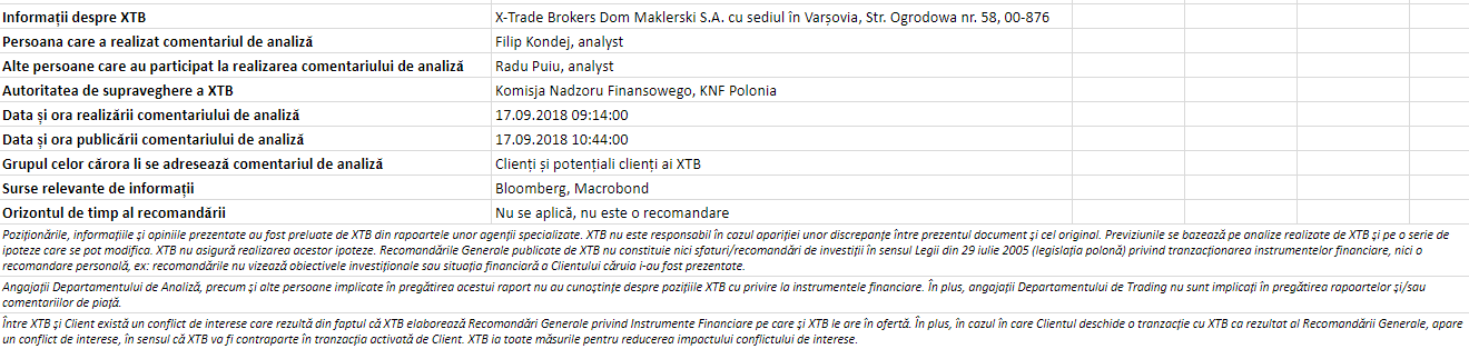 "Acest material este o comunicare de marketing în sensul articolului 24 alineatul (3) din Directiva 2014/65 / UE a Parlamentului European și a Consiliului din 15 mai 2014 privind piețele de instrumente financiare, și de modificare a Directivei 2002/92 / CE și a Directivei 2011 / 61 / UE (MiFID II). Comunicarea de marketing nu este o recomandare de investiții sau o recomandare de informații sau o recomandare care sugerează o strategie de investiții în sensul Regulamentului (UE) nr. 596/2014 al Parlamentului European și al Consiliului din 16 aprilie 2014 privind abuzul de piață ( reglementarea abuzului de piață) și de abrogare a Directivei 2003/6 / CE a Parlamentului European și a Consiliului și a Directivelor Comisiei 2003/124 / CE, 2003/125 / CE și 2004/72 / CE și a Regulamentului delegat (UE) 2016/958 al Comisiei din 9 596/2014 al Parlamentului European și al Consiliului în ceea ce privește standardele tehnice de reglementare pentru aranjamentele tehnice pentru prezentarea obiectivă a recomandărilor de investiții sau a altor informații care sugerează strategii de investiții și pentru dezvăluirea de interese particulare sau indicații de conflicte de interese sau orice alte sfaturi, inclusiv în domeniul consultanței în materie de investiții, în sensul Legii privind tranzacționarea cu instrumente financiare din 29 iulie 2005 (de ex. Journal of Laws 2019, articolul 875, astfel cum a fost modificat). Comunicarea de marketing este pregătită cu cea mai mare diligență, obiectivitate, prezintă faptele cunoscute autorului la data pregătirii și este lipsită de orice elemente de evaluare. Comunicarea de marketing este pregătită fără a lua în considerare nevoile clientului, situația sa financiară individuală și nu prezintă nicio strategie de investiții în niciun fel. Comunicarea de marketing nu constituie o ofertă de vânzare, oferire, abonament, invitație la cumpărare, reclamă sau promovare a oricărui instrument financiar. XTB SA nu este responsabilă pentru acțiunile sau omisiunile niciunui client, în special pentru achiziționarea sau cedarea instrumente, întreprinse pe baza informațiilor conținute în această comunicare de marketing. XTB SA nu va accepta răspunderea pentru nicio pierdere sau daună, inclusiv, fără limitare, orice pierdere care poate apărea direct sau indirect, efectuată pe baza informațiilor conținute în această comunicare de marketing. În cazul în care comunicarea de marketing conține informații despre orice rezultat cu privire la instrumentele financiare indicate în acestea, acestea nu constituie nicio garanție sau prognoză cu privire la rezultatele viitoare. Performanțele anterioare nu indică neapărat rezultatele viitoare și orice persoană care acționează pe baza acestor informații o face pe propriul risc. Acest material nu este emis pentru a influenta deciziile de tranzacționare ale niciunei persoane. Informațiile cuprinse în cadrul acestui material nu sunt prezentate pentru a fi aplicate, copiate sau testate în cadrul tranzacțiilor dumneavoastră. Informațiile cuprinse în cadrul acestui material sunt emise în baza experienței proprii a emitentului și nu reprezintă o recomandare individuală, nu vizează atingerea anumitor obiective, randamente financiare și nu se adresează nevoilor niciunei persoane anume care ar primi-o. Premisele acestui material nu au în vedere situația și persoana dumneavoastră deci nu recomandăm utilizarea acestor informații sub orice formă. Utilizarea informațiilor cuprinse în cadrul acestui material în orice modalitate se face pe propria dumneavoastră răspundere. Acest material este emis de către un analist pentru care își asumă răspunderea XTB SA, persoană juridică autorizată de KNF – Autoritatea de Supraveghere Financiara din Polonia."