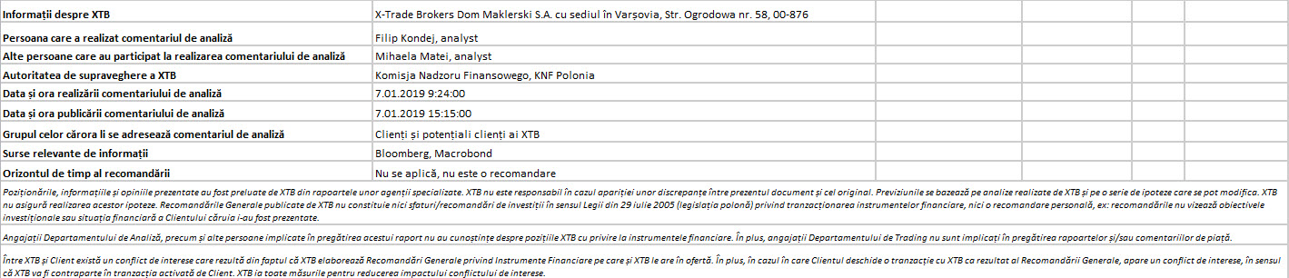 "Acest material este o comunicare de marketing în sensul articolului 24 alineatul (3) din Directiva 2014/65 / UE a Parlamentului European și a Consiliului din 15 mai 2014 privind piețele de instrumente financiare, și de modificare a Directivei 2002/92 / CE și a Directivei 2011 / 61 / UE (MiFID II). Comunicarea de marketing nu este o recomandare de investiții sau o recomandare de informații sau o recomandare care sugerează o strategie de investiții în sensul Regulamentului (UE) nr. 596/2014 al Parlamentului European și al Consiliului din 16 aprilie 2014 privind abuzul de piață ( reglementarea abuzului de piață) și de abrogare a Directivei 2003/6 / CE a Parlamentului European și a Consiliului și a Directivelor Comisiei 2003/124 / CE, 2003/125 / CE și 2004/72 / CE și a Regulamentului delegat (UE) 2016/958 al Comisiei din 9 596/2014 al Parlamentului European și al Consiliului în ceea ce privește standardele tehnice de reglementare pentru aranjamentele tehnice pentru prezentarea obiectivă a recomandărilor de investiții sau a altor informații care sugerează strategii de investiții și pentru dezvăluirea de interese particulare sau indicații de conflicte de interese sau orice alte sfaturi, inclusiv în domeniul consultanței în materie de investiții, în sensul Legii privind tranzacționarea cu instrumente financiare din 29 iulie 2005 (de ex. Journal of Laws 2019, articolul 875, astfel cum a fost modificat). Comunicarea de marketing este pregătită cu cea mai mare diligență, obiectivitate, prezintă faptele cunoscute autorului la data pregătirii și este lipsită de orice elemente de evaluare. Comunicarea de marketing este pregătită fără a lua în considerare nevoile clientului, situația sa financiară individuală și nu prezintă nicio strategie de investiții în niciun fel. Comunicarea de marketing nu constituie o ofertă de vânzare, oferire, abonament, invitație la cumpărare, reclamă sau promovare a oricărui instrument financiar. XTB SA nu este responsabilă pentru acțiunile sau omisiunile niciunui client, în special pentru achiziționarea sau cedarea instrumente, întreprinse pe baza informațiilor conținute în această comunicare de marketing. XTB SA nu va accepta răspunderea pentru nicio pierdere sau daună, inclusiv, fără limitare, orice pierdere care poate apărea direct sau indirect, efectuată pe baza informațiilor conținute în această comunicare de marketing. În cazul în care comunicarea de marketing conține informații despre orice rezultat cu privire la instrumentele financiare indicate în acestea, acestea nu constituie nicio garanție sau prognoză cu privire la rezultatele viitoare. Performanțele anterioare nu indică neapărat rezultatele viitoare și orice persoană care acționează pe baza acestor informații o face pe propriul risc. Acest material nu este emis pentru a influenta deciziile de tranzacționare ale niciunei persoane. Informațiile cuprinse în cadrul acestui material nu sunt prezentate pentru a fi aplicate, copiate sau testate în cadrul tranzacțiilor dumneavoastră. Informațiile cuprinse în cadrul acestui material sunt emise în baza experienței proprii a emitentului și nu reprezintă o recomandare individuală, nu vizează atingerea anumitor obiective, randamente financiare și nu se adresează nevoilor niciunei persoane anume care ar primi-o. Premisele acestui material nu au în vedere situația și persoana dumneavoastră deci nu recomandăm utilizarea acestor informații sub orice formă. Utilizarea informațiilor cuprinse în cadrul acestui material în orice modalitate se face pe propria dumneavoastră răspundere. Acest material este emis de către un analist pentru care își asumă răspunderea XTB SA, persoană juridică autorizată de KNF – Autoritatea de Supraveghere Financiara din Polonia."