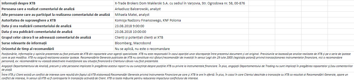 "Acest material este o comunicare de marketing în sensul articolului 24 alineatul (3) din Directiva 2014/65 / UE a Parlamentului European și a Consiliului din 15 mai 2014 privind piețele de instrumente financiare, și de modificare a Directivei 2002/92 / CE și a Directivei 2011 / 61 / UE (MiFID II). Comunicarea de marketing nu este o recomandare de investiții sau o recomandare de informații sau o recomandare care sugerează o strategie de investiții în sensul Regulamentului (UE) nr. 596/2014 al Parlamentului European și al Consiliului din 16 aprilie 2014 privind abuzul de piață ( reglementarea abuzului de piață) și de abrogare a Directivei 2003/6 / CE a Parlamentului European și a Consiliului și a Directivelor Comisiei 2003/124 / CE, 2003/125 / CE și 2004/72 / CE și a Regulamentului delegat (UE) 2016/958 al Comisiei din 9 596/2014 al Parlamentului European și al Consiliului în ceea ce privește standardele tehnice de reglementare pentru aranjamentele tehnice pentru prezentarea obiectivă a recomandărilor de investiții sau a altor informații care sugerează strategii de investiții și pentru dezvăluirea de interese particulare sau indicații de conflicte de interese sau orice alte sfaturi, inclusiv în domeniul consultanței în materie de investiții, în sensul Legii privind tranzacționarea cu instrumente financiare din 29 iulie 2005 (de ex. Journal of Laws 2019, articolul 875, astfel cum a fost modificat). Comunicarea de marketing este pregătită cu cea mai mare diligență, obiectivitate, prezintă faptele cunoscute autorului la data pregătirii și este lipsită de orice elemente de evaluare. Comunicarea de marketing este pregătită fără a lua în considerare nevoile clientului, situația sa financiară individuală și nu prezintă nicio strategie de investiții în niciun fel. Comunicarea de marketing nu constituie o ofertă de vânzare, oferire, abonament, invitație la cumpărare, reclamă sau promovare a oricărui instrument financiar. XTB SA nu este responsabilă pentru acțiunile sau omisiunile niciunui client, în special pentru achiziționarea sau cedarea instrumente, întreprinse pe baza informațiilor conținute în această comunicare de marketing. XTB SA nu va accepta răspunderea pentru nicio pierdere sau daună, inclusiv, fără limitare, orice pierdere care poate apărea direct sau indirect, efectuată pe baza informațiilor conținute în această comunicare de marketing. În cazul în care comunicarea de marketing conține informații despre orice rezultat cu privire la instrumentele financiare indicate în acestea, acestea nu constituie nicio garanție sau prognoză cu privire la rezultatele viitoare. Performanțele anterioare nu indică neapărat rezultatele viitoare și orice persoană care acționează pe baza acestor informații o face pe propriul risc. Acest material nu este emis pentru a influenta deciziile de tranzacționare ale niciunei persoane. Informațiile cuprinse în cadrul acestui material nu sunt prezentate pentru a fi aplicate, copiate sau testate în cadrul tranzacțiilor dumneavoastră. Informațiile cuprinse în cadrul acestui material sunt emise în baza experienței proprii a emitentului și nu reprezintă o recomandare individuală, nu vizează atingerea anumitor obiective, randamente financiare și nu se adresează nevoilor niciunei persoane anume care ar primi-o. Premisele acestui material nu au în vedere situația și persoana dumneavoastră deci nu recomandăm utilizarea acestor informații sub orice formă. Utilizarea informațiilor cuprinse în cadrul acestui material în orice modalitate se face pe propria dumneavoastră răspundere. Acest material este emis de către un analist pentru care își asumă răspunderea XTB SA, persoană juridică autorizată de KNF – Autoritatea de Supraveghere Financiara din Polonia."