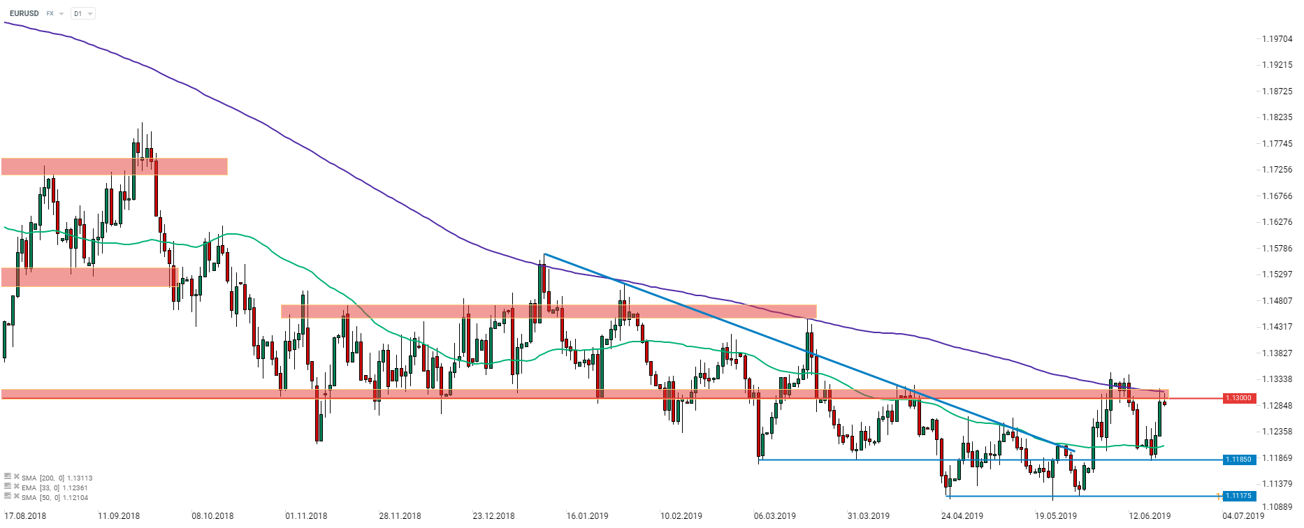 Cotația EURUSD s-a apreciat semnificativ după ultimul mesaj dovish transmis de Fed. Cu toate acestea, perechea testează din nou media mobilă de 200 de perioade (linia mov pe graficul de mai sus). Aceasta a fost testată de 5 ori în ultimele 7 luni, iar cumpărătorii au ușuat în a o depăși. Având în vedere că perechea se tranzacționează aproape de această medie mobilă și de rezistența de la 1,13, nu putem exclude o corecție mai puternică, mai ales dacă este declanșată de o altă dezamăgire a datelor din Germania. Sursa: xStation5