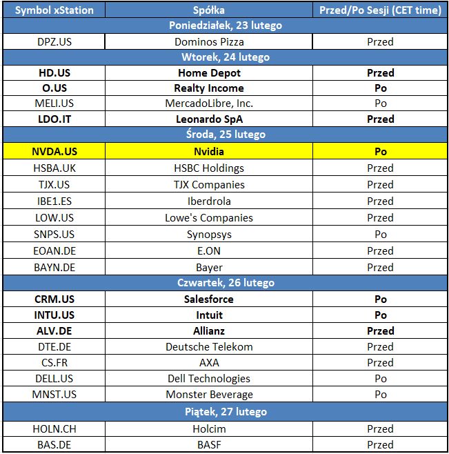 Pentru investitorii de pe piața de capital, evenimentul cheie va fi publicarea celui mai important raport al întregului sezon de raportare a rezultatelor financiare – Nvidia. Atenția investitorilor se va concentra și asupra companiilor din sectorul consumatorilor, tehnologiei și asigurărilor. Următoarele companii își vor prezenta rapoartele trimestriale: