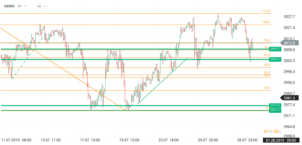 Încrederea consumatorilor americani, în varianta Conf. Board, a atins un nivel de 135.7 puncte, depășit doar în 2 rânduri în ultimii 10 ani, o masivă surpriză plăcută pe seama unor evaluări foarte optimiste ale condițiilor prezente din ale mediului de afaceri și piața muncii, unde subindicele a câștigat 6.6 puncte, dar cu un și mai important salte pentru așteptările pe termen scurt: 14.6 puncte. Publicarea a dus la creșteri în bursa americană, și a redus pentru o vreme apetitul pentru aur. Cât de mult schimbă, însă, această publicare, perspectiva pe termen mediu a investitorilor în bursa din SUA? Investitorii de la CME pe rata dobânzii ar putea răspunde: nu prea mult, probabilitatea de tăiere mâine cu 0.5 puncte fluctuând modest în perioada de după ora 17, cu câteva puncte în jurul nivelului de 24%. Discuțiile cu China sunt în desfășurare, și o postare pe Twitter a președintelui SUA, critică la adresa Chinei, și ”fără vreun semn” de cumpărări de produse agricole oglindește un entuziasm în declin vis-a-vis de o înțelegere cuprinzătoare. Bursa așteaptă, pe lângă rezultatele Apple, foarte relevante pe termen scurt, încheierea vizitei delegației americane la Shanghai, decizia Fed, și ghidajul pentru viitor, de care reacția poate depinde chiar mai mult decât de așteptata tăiere de 0.25 puncte. Mișcarea laterală a US500 continuă, între 2998 și 3029.