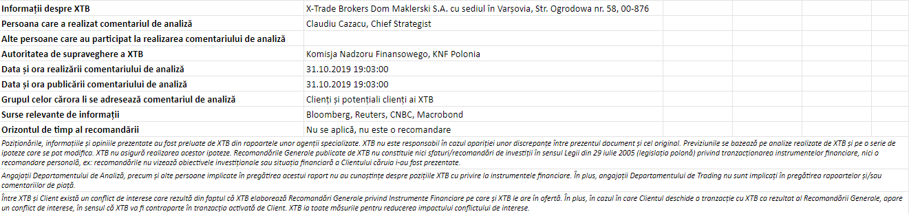 "Acest material este o comunicare de marketing în sensul articolului 24 alineatul (3) din Directiva 2014/65 / UE a Parlamentului European și a Consiliului din 15 mai 2014 privind piețele de instrumente financiare, și de modificare a Directivei 2002/92 / CE și a Directivei 2011 / 61 / UE (MiFID II). Comunicarea de marketing nu este o recomandare de investiții sau o recomandare de informații sau o recomandare care sugerează o strategie de investiții în sensul Regulamentului (UE) nr. 596/2014 al Parlamentului European și al Consiliului din 16 aprilie 2014 privind abuzul de piață ( reglementarea abuzului de piață) și de abrogare a Directivei 2003/6 / CE a Parlamentului European și a Consiliului și a Directivelor Comisiei 2003/124 / CE, 2003/125 / CE și 2004/72 / CE și a Regulamentului delegat (UE) 2016/958 al Comisiei din 9 596/2014 al Parlamentului European și al Consiliului în ceea ce privește standardele tehnice de reglementare pentru aranjamentele tehnice pentru prezentarea obiectivă a recomandărilor de investiții sau a altor informații care sugerează strategii de investiții și pentru dezvăluirea de interese particulare sau indicații de conflicte de interese sau orice alte sfaturi, inclusiv în domeniul consultanței în materie de investiții, în sensul Legii privind tranzacționarea cu instrumente financiare din 29 iulie 2005 (de ex. Journal of Laws 2019, articolul 875, astfel cum a fost modificat). Comunicarea de marketing este pregătită cu cea mai mare diligență, obiectivitate, prezintă faptele cunoscute autorului la data pregătirii și este lipsită de orice elemente de evaluare. Comunicarea de marketing este pregătită fără a lua în considerare nevoile clientului, situația sa financiară individuală și nu prezintă nicio strategie de investiții în niciun fel. Comunicarea de marketing nu constituie o ofertă de vânzare, oferire, abonament, invitație la cumpărare, reclamă sau promovare a oricărui instrument financiar. XTB SA nu este responsabilă pentru acțiunile sau omisiunile niciunui client, în special pentru achiziționarea sau cedarea instrumente, întreprinse pe baza informațiilor conținute în această comunicare de marketing. XTB SA nu va accepta răspunderea pentru nicio pierdere sau daună, inclusiv, fără limitare, orice pierdere care poate apărea direct sau indirect, efectuată pe baza informațiilor conținute în această comunicare de marketing. În cazul în care comunicarea de marketing conține informații despre orice rezultat cu privire la instrumentele financiare indicate în acestea, acestea nu constituie nicio garanție sau prognoză cu privire la rezultatele viitoare. Performanțele anterioare nu indică neapărat rezultatele viitoare și orice persoană care acționează pe baza acestor informații o face pe propriul risc. Acest material nu este emis pentru a influenta deciziile de tranzacționare ale niciunei persoane. Informațiile cuprinse în cadrul acestui material nu sunt prezentate pentru a fi aplicate, copiate sau testate în cadrul tranzacțiilor dumneavoastră. Informațiile cuprinse în cadrul acestui material sunt emise în baza experienței proprii a emitentului și nu reprezintă o recomandare individuală, nu vizează atingerea anumitor obiective, randamente financiare și nu se adresează nevoilor niciunei persoane anume care ar primi-o. Premisele acestui material nu au în vedere situația și persoana dumneavoastră deci nu recomandăm utilizarea acestor informații sub orice formă. Utilizarea informațiilor cuprinse în cadrul acestui material în orice modalitate se face pe propria dumneavoastră răspundere. Acest material este emis de către un analist pentru care își asumă răspunderea XTB SA, persoană juridică autorizată de KNF – Autoritatea de Supraveghere Financiara din Polonia."