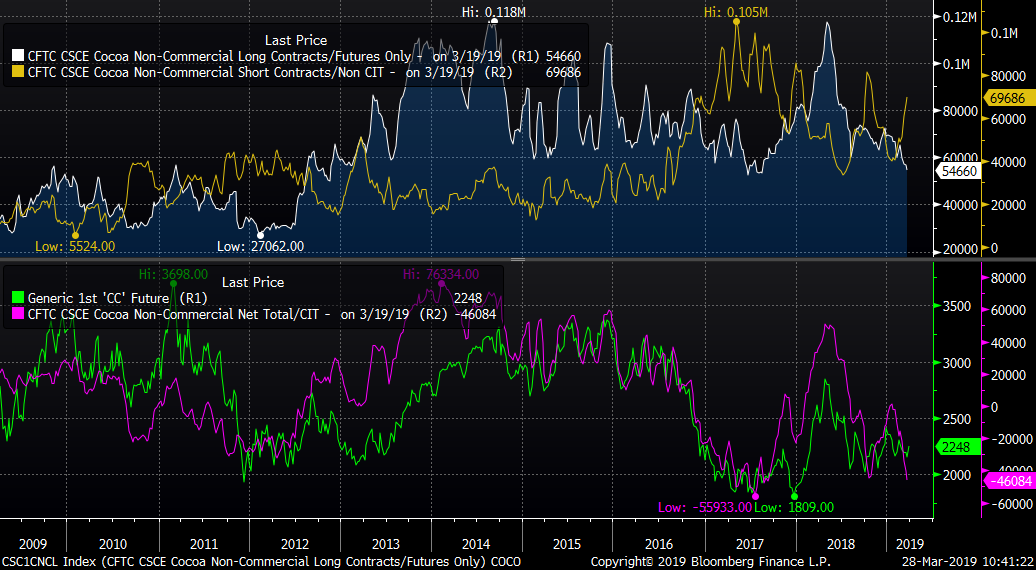 Datele privind poziționarea oferă un semnal puternic de cumpărare. Cu toate acestea, deși numărul de poziții long s-a redus în ultima perioadă, numărul de poziții short a crescut. Piața de cacao este una dintre cele mai speculative prin natura sa, traderii dorind să-i forțeze pe producătorii majori să scadă prețurile. Având în vedere acest lucru, ne așteptăm ca pozițiile short să crească pe termen scurt, ceea ce ar putea determina o reducere a prețurilpr. Scăderea poziționării nete sub nivelul de -60 de mii ar putea reprezenta un puternic semnal de cumpărare. Sursa: Bloomberg