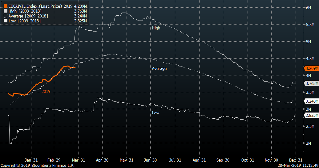Stocurile de cacao din porturi își urmează media pe 10 ani. Sursa: Bloomberg