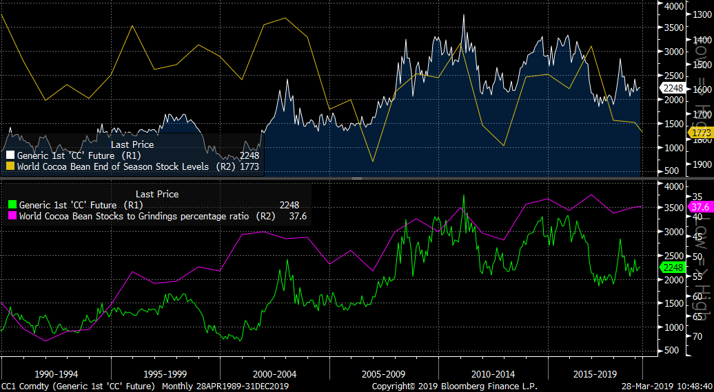Nivelul stocurilor de cacao este destul de ridicat, însă perspectivele pe termen lung nu sunt pesimiste. Raportul dintre stocuri și consum se situează în jurul minimului istoric, situație ce oferă vești bune pentru cumpărători. Sursa: Bloomberg