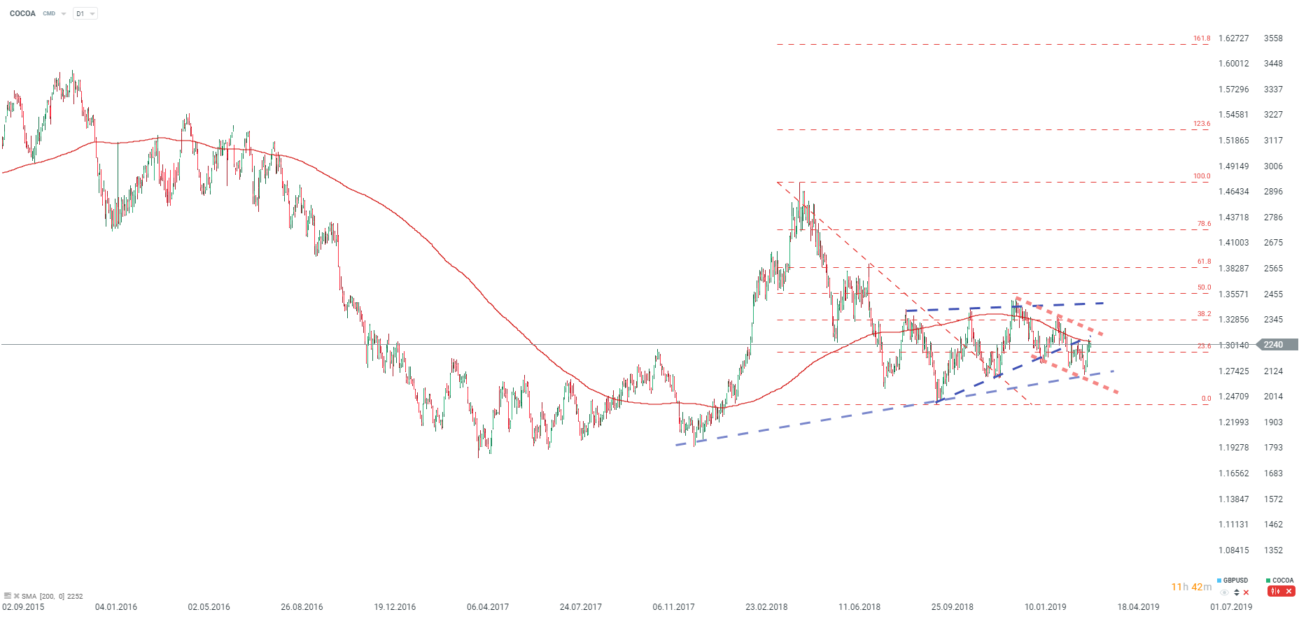 Perspectiva fundamentală nu pare pesimistă pentru piața de cacao. Datele pentru noiembrie au indicat un excedent de producție de 22 de mii de tone, dar datele au fost revizuite până la 9 mii de tone. Proiecția pentru anul viitor indică o creștere suplimentară a producției, care s-ar putea transforma într-o creștere a stocurilor. Pe de altă parte, se estimează ca raportul stocuri/consum să scadă, ceea ce ar putea susține prețurile pe termen mediu și lung. De asemenea, merită menționat faptul că un excedent a devenit o situație normală în ultimii ani. Cu toate acestea, în anii în care excedentul a fost în scădere, au fost înregistrate creșteri ale prețurilor.