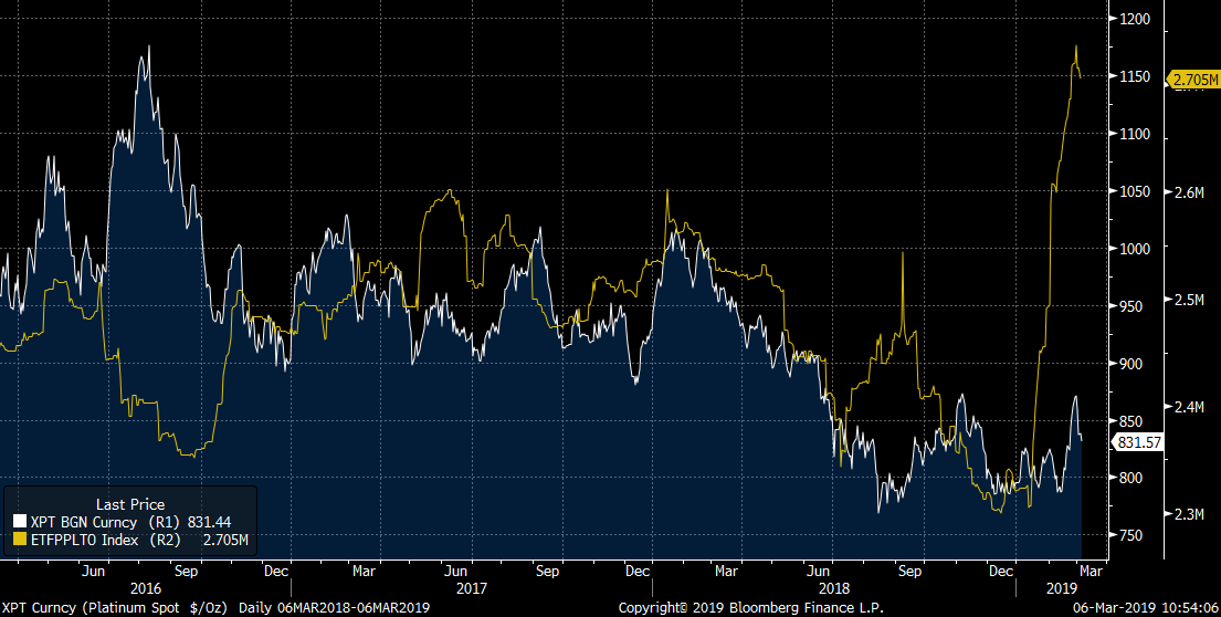 Prin intermediul ETF-urilor s-au cumpărat până în 2019 peste 400k uncii de platină. Vom vedea în cele din urmă o inversare? Sursa: Bloomberg