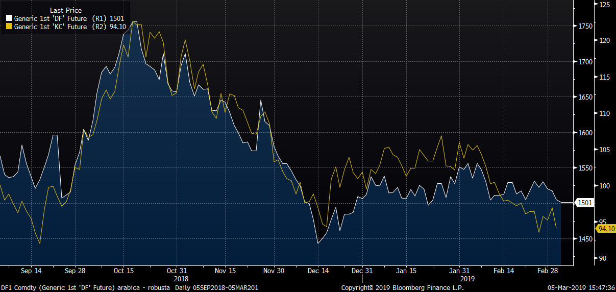 În ciuda problemei privind producția în Brazilia și Vietnam, prețul Robusta înregistrează o performanță similară cu cea a Arabicii. Sursa: Bloomberg