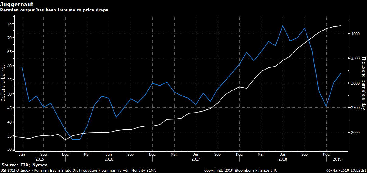 Producția brută din Permian continuă să crească, deși ritmul acesteia a decelerat recent. Cele mai mari companii producătoare de petrol sugerează că, în următorii patru ani, producția ar putea crește cu până la 2 mbpd. Sursa: Bloomberg