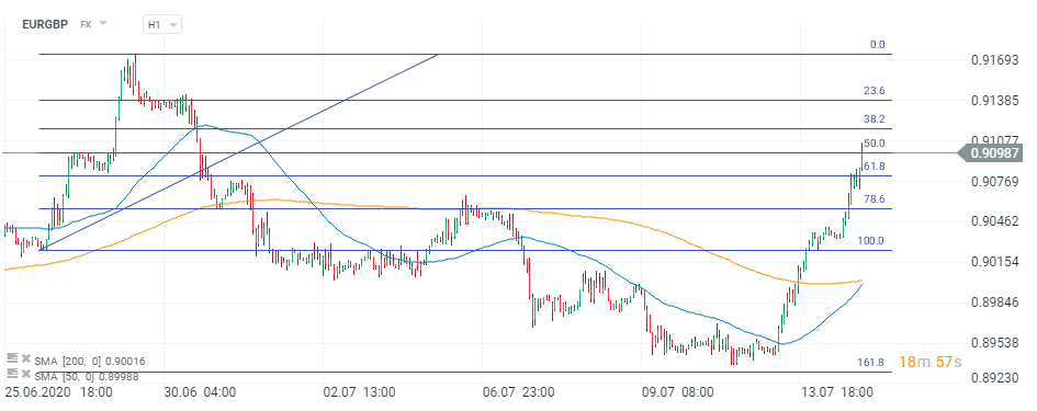 Din punct de vedere tehnic, moneda unică europeană se află într-o secvență ascendentă clară, beneficiind de susținerea factorilor fundamentali. Totuși, testarea nivelului de rezistență de la 0,91 pare a fi o încercare prea curajoasă pentru cumpărători, cel puțin pentru moment, aceasta fiind susținută de o retragere Fibonacci de 50% din impulsul de creștere de la sfârșitul lunii iunie. Suprafața a pus și în trecut probleme, iar în cazul în care optimismul cumpărătorilor se menține am putea asista la o repetare a scenariului inițial, următorul nivel de rezistență fiind la 0,9140, unde se găsește nivelul Fibonacci de 23,6% din aceeași mișcare. În eventualitatea unei corecții, suportul se regăsește la 0,90560, susținut de o retragere de 78,6%. Investitorii au fost dezamăgiți în urma publicării datelor referitoare la PIB-ul britanic, realizând că recuperarea economică din insulă ar putea să fie mult mai lentă decât în alte regiuni ale continentului.
