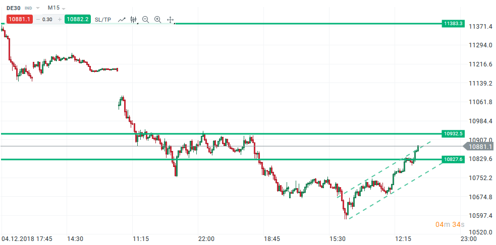 Din nou speranțele unui ”dezgheț” ajută indicii bursieri europeni, și, pe futures, pe cei americani Potrivit Zerohedge și Bloomberg, informații pe surse ar sugera că în China pregătește o diminuare a taxelor vamale pentru automobilele importate din SUA, răspunzând astfel solicitării președintelui Trump care fusese inițial lăsată în ”off-side” de lipsa unor comentarii de susținere din partea oficialilor. Este o informație care trebuie privită totuși cu o relativă distanță, nefiind confirmată oficial. Sentimentul pozitiv fusese totuși instalat chiar din timpul revenirii de ieri din sesiunea americană. De dimineață, susținerea a venit și din accelerarea creditării noi în China, la 1.25 trilioane de yuani un ritm aproape dublu față de cel anterior. Indicii de sentiment ZEW au arătat valori mai bune, mai ales în varianta pentru Germania, ajungând la -17.5 de la -24.1 de puncte. Pe de altă parte, Italia ar fi aproape de o înțelegere pentru o țintă de deficit sub 2%, dar Franța poate să își adâncească deficitul în urma măsurilor noi de relaxare anunțate de președintele Macron. Este interesant, de asemenea, că publicarea unor cifre de inflație la nivelul producătorilor peste așteptări, în SUA, cu un nivel de 2.7% anualizat în varianta core nu a dus la scăderi pe futures în SUA și nici în Europa, investitorii fiind înclinați să vadă partea plină a paharului. Este de văzut, însă, dacă entuziasmul se va menține la acest nivel în orele următoare, după deschiderea bursei SUA de la 16.30, având în vedere limita superioară a canalului de trend ascendent deja atinsă în cazul DE30.