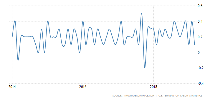 Câștigul mediu orar în SUA, lunar. Sursa: BLS, Tradingeconomics.com