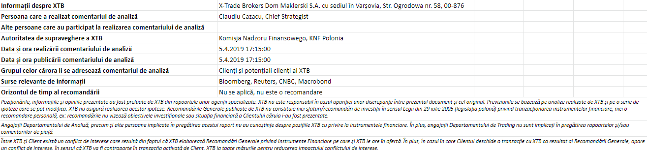 "Acest material este o comunicare de marketing în sensul articolului 24 alineatul (3) din Directiva 2014/65 / UE a Parlamentului European și a Consiliului din 15 mai 2014 privind piețele de instrumente financiare, și de modificare a Directivei 2002/92 / CE și a Directivei 2011 / 61 / UE (MiFID II). Comunicarea de marketing nu este o recomandare de investiții sau o recomandare de informații sau o recomandare care sugerează o strategie de investiții în sensul Regulamentului (UE) nr. 596/2014 al Parlamentului European și al Consiliului din 16 aprilie 2014 privind abuzul de piață ( reglementarea abuzului de piață) și de abrogare a Directivei 2003/6 / CE a Parlamentului European și a Consiliului și a Directivelor Comisiei 2003/124 / CE, 2003/125 / CE și 2004/72 / CE și a Regulamentului delegat (UE) 2016/958 al Comisiei din 9 596/2014 al Parlamentului European și al Consiliului în ceea ce privește standardele tehnice de reglementare pentru aranjamentele tehnice pentru prezentarea obiectivă a recomandărilor de investiții sau a altor informații care sugerează strategii de investiții și pentru dezvăluirea de interese particulare sau indicații de conflicte de interese sau orice alte sfaturi, inclusiv în domeniul consultanței în materie de investiții, în sensul Legii privind tranzacționarea cu instrumente financiare din 29 iulie 2005 (de ex. Journal of Laws 2019, articolul 875, astfel cum a fost modificat). Comunicarea de marketing este pregătită cu cea mai mare diligență, obiectivitate, prezintă faptele cunoscute autorului la data pregătirii și este lipsită de orice elemente de evaluare. Comunicarea de marketing este pregătită fără a lua în considerare nevoile clientului, situația sa financiară individuală și nu prezintă nicio strategie de investiții în niciun fel. Comunicarea de marketing nu constituie o ofertă de vânzare, oferire, abonament, invitație la cumpărare, reclamă sau promovare a oricărui instrument financiar. XTB SA nu este responsabilă pentru acțiunile sau omisiunile niciunui client, în special pentru achiziționarea sau cedarea instrumente, întreprinse pe baza informațiilor conținute în această comunicare de marketing. XTB SA nu va accepta răspunderea pentru nicio pierdere sau daună, inclusiv, fără limitare, orice pierdere care poate apărea direct sau indirect, efectuată pe baza informațiilor conținute în această comunicare de marketing. În cazul în care comunicarea de marketing conține informații despre orice rezultat cu privire la instrumentele financiare indicate în acestea, acestea nu constituie nicio garanție sau prognoză cu privire la rezultatele viitoare. Performanțele anterioare nu indică neapărat rezultatele viitoare și orice persoană care acționează pe baza acestor informații o face pe propriul risc. Acest material nu este emis pentru a influenta deciziile de tranzacționare ale niciunei persoane. Informațiile cuprinse în cadrul acestui material nu sunt prezentate pentru a fi aplicate, copiate sau testate în cadrul tranzacțiilor dumneavoastră. Informațiile cuprinse în cadrul acestui material sunt emise în baza experienței proprii a emitentului și nu reprezintă o recomandare individuală, nu vizează atingerea anumitor obiective, randamente financiare și nu se adresează nevoilor niciunei persoane anume care ar primi-o. Premisele acestui material nu au în vedere situația și persoana dumneavoastră deci nu recomandăm utilizarea acestor informații sub orice formă. Utilizarea informațiilor cuprinse în cadrul acestui material în orice modalitate se face pe propria dumneavoastră răspundere. Acest material este emis de către un analist pentru care își asumă răspunderea XTB SA, persoană juridică autorizată de KNF – Autoritatea de Supraveghere Financiara din Polonia."