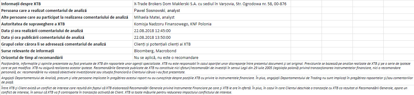 "Acest material este o comunicare de marketing în sensul articolului 24 alineatul (3) din Directiva 2014/65 / UE a Parlamentului European și a Consiliului din 15 mai 2014 privind piețele de instrumente financiare, și de modificare a Directivei 2002/92 / CE și a Directivei 2011 / 61 / UE (MiFID II). Comunicarea de marketing nu este o recomandare de investiții sau o recomandare de informații sau o recomandare care sugerează o strategie de investiții în sensul Regulamentului (UE) nr. 596/2014 al Parlamentului European și al Consiliului din 16 aprilie 2014 privind abuzul de piață ( reglementarea abuzului de piață) și de abrogare a Directivei 2003/6 / CE a Parlamentului European și a Consiliului și a Directivelor Comisiei 2003/124 / CE, 2003/125 / CE și 2004/72 / CE și a Regulamentului delegat (UE) 2016/958 al Comisiei din 9 596/2014 al Parlamentului European și al Consiliului în ceea ce privește standardele tehnice de reglementare pentru aranjamentele tehnice pentru prezentarea obiectivă a recomandărilor de investiții sau a altor informații care sugerează strategii de investiții și pentru dezvăluirea de interese particulare sau indicații de conflicte de interese sau orice alte sfaturi, inclusiv în domeniul consultanței în materie de investiții, în sensul Legii privind tranzacționarea cu instrumente financiare din 29 iulie 2005 (de ex. Journal of Laws 2019, articolul 875, astfel cum a fost modificat). Comunicarea de marketing este pregătită cu cea mai mare diligență, obiectivitate, prezintă faptele cunoscute autorului la data pregătirii și este lipsită de orice elemente de evaluare. Comunicarea de marketing este pregătită fără a lua în considerare nevoile clientului, situația sa financiară individuală și nu prezintă nicio strategie de investiții în niciun fel. Comunicarea de marketing nu constituie o ofertă de vânzare, oferire, abonament, invitație la cumpărare, reclamă sau promovare a oricărui instrument financiar. XTB SA nu este responsabilă pentru acțiunile sau omisiunile niciunui client, în special pentru achiziționarea sau cedarea instrumente, întreprinse pe baza informațiilor conținute în această comunicare de marketing. XTB SA nu va accepta răspunderea pentru nicio pierdere sau daună, inclusiv, fără limitare, orice pierdere care poate apărea direct sau indirect, efectuată pe baza informațiilor conținute în această comunicare de marketing. În cazul în care comunicarea de marketing conține informații despre orice rezultat cu privire la instrumentele financiare indicate în acestea, acestea nu constituie nicio garanție sau prognoză cu privire la rezultatele viitoare. Performanțele anterioare nu indică neapărat rezultatele viitoare și orice persoană care acționează pe baza acestor informații o face pe propriul risc. Acest material nu este emis pentru a influenta deciziile de tranzacționare ale niciunei persoane. Informațiile cuprinse în cadrul acestui material nu sunt prezentate pentru a fi aplicate, copiate sau testate în cadrul tranzacțiilor dumneavoastră. Informațiile cuprinse în cadrul acestui material sunt emise în baza experienței proprii a emitentului și nu reprezintă o recomandare individuală, nu vizează atingerea anumitor obiective, randamente financiare și nu se adresează nevoilor niciunei persoane anume care ar primi-o. Premisele acestui material nu au în vedere situația și persoana dumneavoastră deci nu recomandăm utilizarea acestor informații sub orice formă. Utilizarea informațiilor cuprinse în cadrul acestui material în orice modalitate se face pe propria dumneavoastră răspundere. Acest material este emis de către un analist pentru care își asumă răspunderea XTB SA, persoană juridică autorizată de KNF – Autoritatea de Supraveghere Financiara din Polonia."