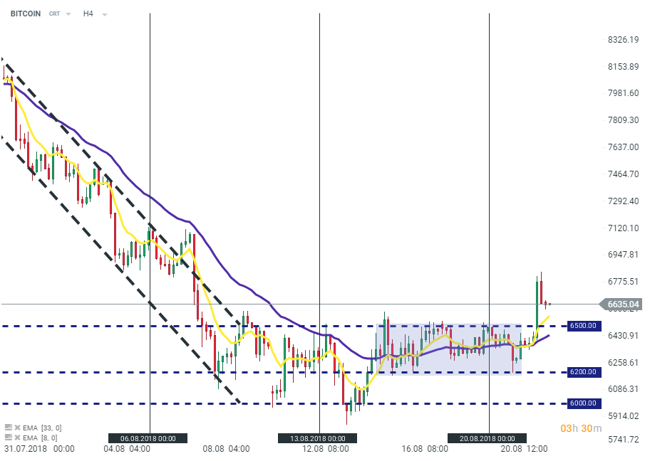 BITCOIN a atins din nou nivelul de 6800 de dolari, însă s-a corectat rapid de la acel nivel. Cu toate acestea, prețul a spart nivelul psihologic de 6500 de dolari și se tranzacționează în jurul valorii de 6650 dolari la momentul scrierii articolului. Sursa: xStation5