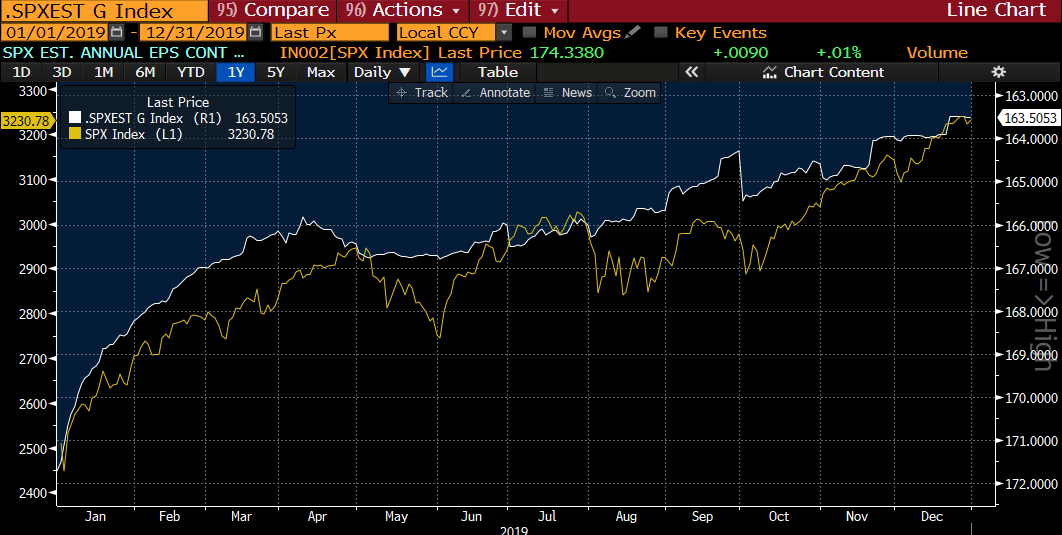 S&P 500 a continuat să crească pe tot parcursul anului 2019, în ciuda deteriorării estimărilor câștigurilor. Indicatorul EPS (linia albă) este prezentat pe o axă inversată. Sursa: Bloomberg