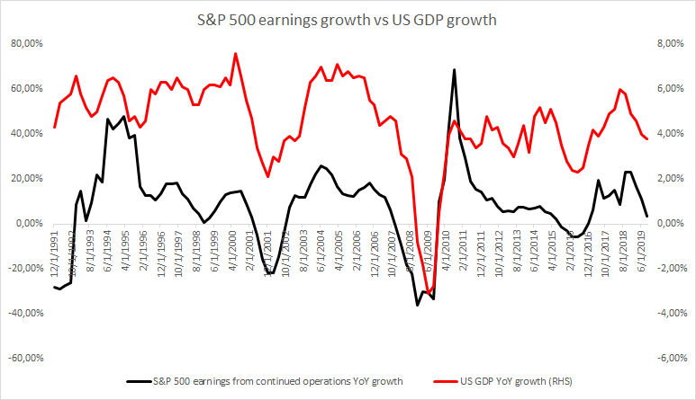 Se spune adesea că piața bursieră din SUA s-a comportat irațional pe tot parcursul anului 2019, deoarece investitorii au omis datele slabe și au continuat să împingă prețul acțiunilor în sus. Desigur, au existat motive de bucurie, deoarece SUA și China au ajuns la un fel de acord comercial, iar Fed a început să-și extindă bilanțul. Însă, nu se schimbă faptul că avem unele bariere comerciale care nu existau în urmă cu un an și semnarea acordului „Faza 1” nu a făcut prea mult să schimbe acest lucru. Mai multe comentarii pe această temă poți găsi în articolul „Actualizare macroeconomică” publicat luni, 13 ianuarie. Această evoluție anormală a indicelui S&P 500 în 2019 poate fi descrisă cel mai bine în graficul de mai jos, unde performanța acestuia este comparată cu cea a indicatorului EPS estimat pe baza operațiunilor continue. O astfel de corelație puternică ar sugera o piață destul de eficientă, însă, în acest caz, câștigurile sunt prezentate pe o axă inversată, ceea ce presupune că S&P 500 a crescut atunci când estimările câștigurilor au scăzut.