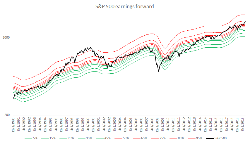 Aruncând o privire asupra graficului de mai jos, ce compară evaluările istorice ale indicelui S&P 500 în ceea ce privește câștigurile estimate de către analiști, se poate observa că acțiunile din componența indicelui nu au mai fost atât de scumpe din aprilie 2018. Acestea se tranzacționează acum la 85% din valorile P/E istorice. Un punct interesant de remarcat este faptul că, la maximul pieței bursiere atins anterior crizei financiare globale, companiile S&P 500 au fost mai ieftine, deoarece se tranzacționau la 65%. În cazul în care S&P 500 ar fi în concordanță cu evaluarea din 2007, indicele ar trebui să se situeze la aproximativ 2880 de puncte - 12,7% mai mic decât în prezent. Cu toate acestea, trebuie menționat faptul că veniturile companiilor sunt mai scăzute decât au fost la sfârșitul mileniului când piața bursieră traversa bula ”dot-com”.