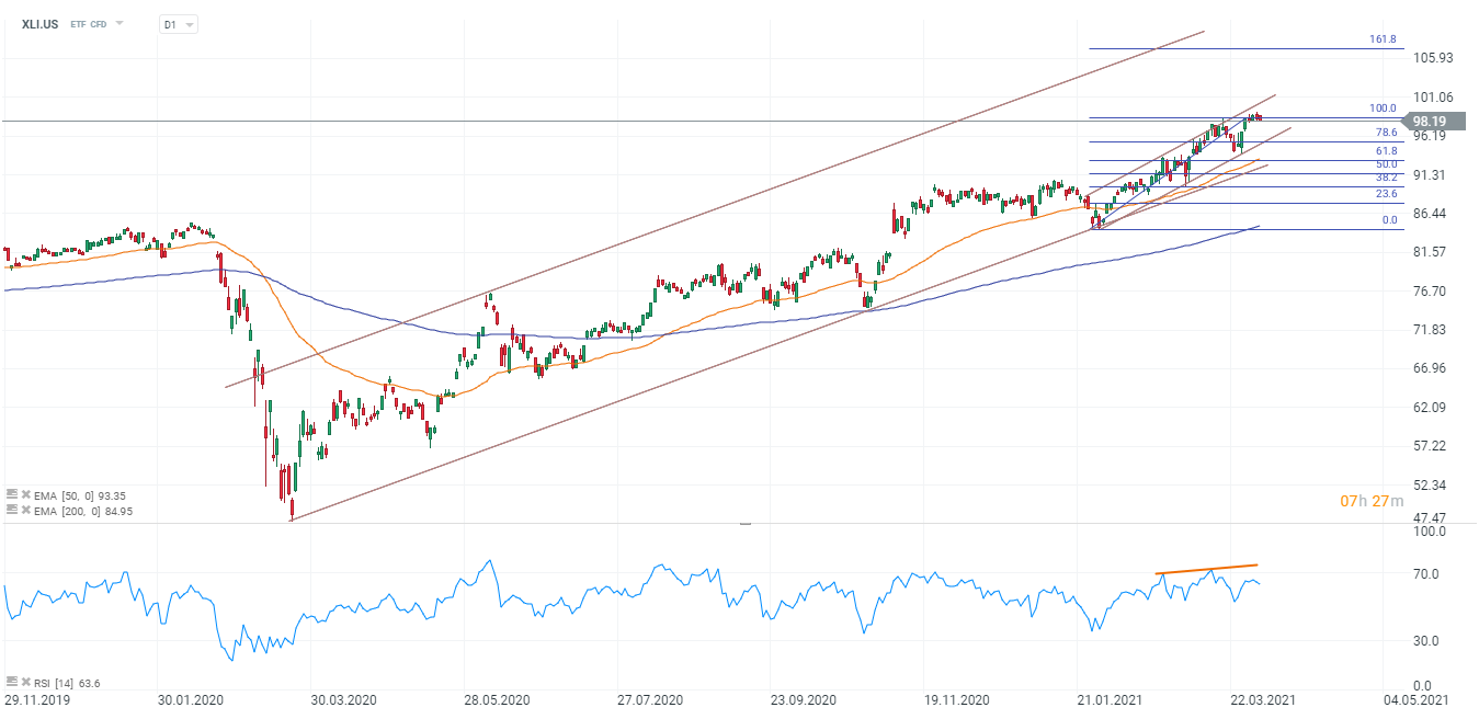În atenția investitorilor care doresc să găsească mișcări de moment a apărut un ETF. Este vorba despre Industrial Select Sector SPDR ETF (XLI), care, recent, a atins un nou maxim istoric. Cotația XLI a crescut cu aproximativ 78,3% față de minimul ultimelor 52 de săptămâni atins la 55,54 USD pe acțiune.