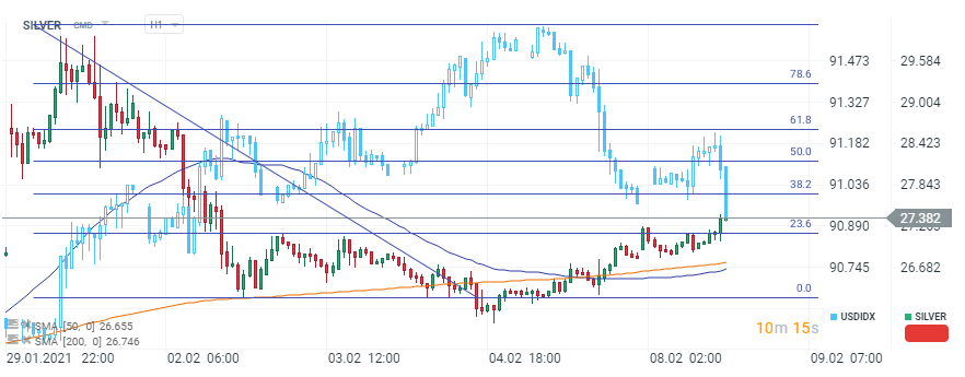 Un dolar mai puternic poate fi negativ pentru prețul mărfurilor. Totuși, la momentul redactării, indicele dolarului american a suferit o scădere, pierzând în totalitate avansul obținut la începutul sesiunii și scăzând în teritoriul negativ. Analizând graficul argintului, observăm că momentul de revenire al metalului prețios corespunde cu această tendință descendentă a indicelui USD (graficul alabastru). Un potențial prim nivel de rezistență pentru argint ar putea fi în zona 27,740 USD per uncie întrucât este marcat de o retragere Fibonacci de 38,2% din corecția de la începutul lunii. În cazul în care ar avea loc o spargere, drumul ar putea fi liber până în zona 28,622 USD, marcată de o retragere de 61,8% și de mai multe reacții de preț. Susținere s-ar putea găsi la 26,300 USD, cel mai apropiat nivel la care au reacționat cumpărătorii.