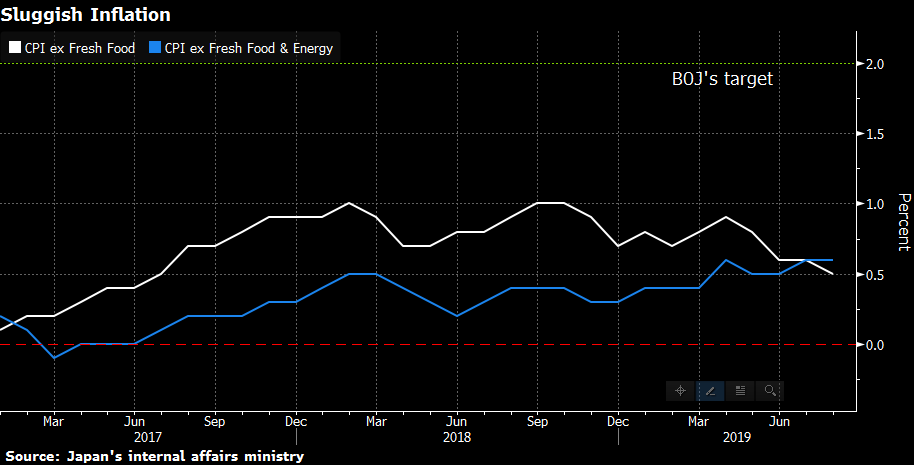 Obiectivul de inflație al BoJ a fost greu de atins de o lungă perioadă de timp și pare că va rămâne așa în viitorul apropiat. Sursa: Bloomberg