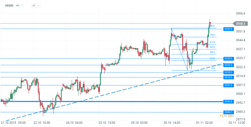 În acest context, indicele US500 a dezvoltat o mișcare de creștere de aproximativ 0,69% în timpul căreia cotația a atins noi maxime istorice la aproximativ 3059,4 puncte. În cadrul acestui impuls ascendent au fost depășite mai multe niveluri de rezistență relevante printre care retragerile Fibonacci de 61,8%, 78,6%, respectiv 100% din impulsul descendent început ieri. Trebuie menționat faptul că, pe termen mediu, cotația rămâne în continuare pe un trend ascendent, iar cât timp linia de trend nu va fi spartă în jos nu putem vorbi despre dezvoltarea unei mișcări de scădere mai ample.