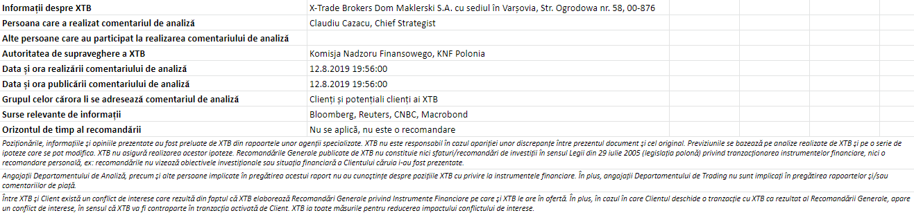 "Acest material este o comunicare de marketing în sensul articolului 24 alineatul (3) din Directiva 2014/65 / UE a Parlamentului European și a Consiliului din 15 mai 2014 privind piețele de instrumente financiare, și de modificare a Directivei 2002/92 / CE și a Directivei 2011 / 61 / UE (MiFID II). Comunicarea de marketing nu este o recomandare de investiții sau o recomandare de informații sau o recomandare care sugerează o strategie de investiții în sensul Regulamentului (UE) nr. 596/2014 al Parlamentului European și al Consiliului din 16 aprilie 2014 privind abuzul de piață ( reglementarea abuzului de piață) și de abrogare a Directivei 2003/6 / CE a Parlamentului European și a Consiliului și a Directivelor Comisiei 2003/124 / CE, 2003/125 / CE și 2004/72 / CE și a Regulamentului delegat (UE) 2016/958 al Comisiei din 9 596/2014 al Parlamentului European și al Consiliului în ceea ce privește standardele tehnice de reglementare pentru aranjamentele tehnice pentru prezentarea obiectivă a recomandărilor de investiții sau a altor informații care sugerează strategii de investiții și pentru dezvăluirea de interese particulare sau indicații de conflicte de interese sau orice alte sfaturi, inclusiv în domeniul consultanței în materie de investiții, în sensul Legii privind tranzacționarea cu instrumente financiare din 29 iulie 2005 (de ex. Journal of Laws 2019, articolul 875, astfel cum a fost modificat). Comunicarea de marketing este pregătită cu cea mai mare diligență, obiectivitate, prezintă faptele cunoscute autorului la data pregătirii și este lipsită de orice elemente de evaluare. Comunicarea de marketing este pregătită fără a lua în considerare nevoile clientului, situația sa financiară individuală și nu prezintă nicio strategie de investiții în niciun fel. Comunicarea de marketing nu constituie o ofertă de vânzare, oferire, abonament, invitație la cumpărare, reclamă sau promovare a oricărui instrument financiar. XTB SA nu este responsabilă pentru acțiunile sau omisiunile niciunui client, în special pentru achiziționarea sau cedarea instrumente, întreprinse pe baza informațiilor conținute în această comunicare de marketing. XTB SA nu va accepta răspunderea pentru nicio pierdere sau daună, inclusiv, fără limitare, orice pierdere care poate apărea direct sau indirect, efectuată pe baza informațiilor conținute în această comunicare de marketing. În cazul în care comunicarea de marketing conține informații despre orice rezultat cu privire la instrumentele financiare indicate în acestea, acestea nu constituie nicio garanție sau prognoză cu privire la rezultatele viitoare. Performanțele anterioare nu indică neapărat rezultatele viitoare și orice persoană care acționează pe baza acestor informații o face pe propriul risc. Acest material nu este emis pentru a influenta deciziile de tranzacționare ale niciunei persoane. Informațiile cuprinse în cadrul acestui material nu sunt prezentate pentru a fi aplicate, copiate sau testate în cadrul tranzacțiilor dumneavoastră. Informațiile cuprinse în cadrul acestui material sunt emise în baza experienței proprii a emitentului și nu reprezintă o recomandare individuală, nu vizează atingerea anumitor obiective, randamente financiare și nu se adresează nevoilor niciunei persoane anume care ar primi-o. Premisele acestui material nu au în vedere situația și persoana dumneavoastră deci nu recomandăm utilizarea acestor informații sub orice formă. Utilizarea informațiilor cuprinse în cadrul acestui material în orice modalitate se face pe propria dumneavoastră răspundere. Acest material este emis de către un analist pentru care își asumă răspunderea XTB SA, persoană juridică autorizată de KNF – Autoritatea de Supraveghere Financiara din Polonia."