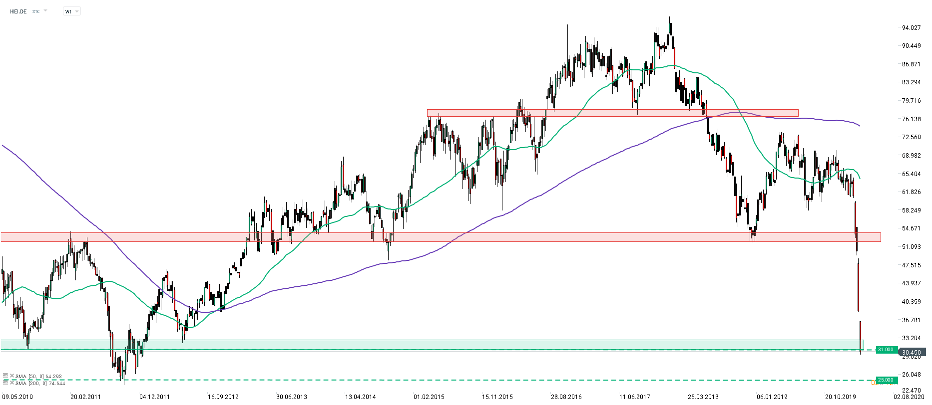 HeidelbergCement (HEI.DE) a pierdut aproximativ jumătate din valoarea sa în ultimele săptămâni. Acțiunile companiei au scăzut sub suportul de la 31,00 EUR săptămâna aceasta și dacă sentimentele investitorilor de pe piețele globale nu se îmbunătățesc, este posibil să fie testat minimul de la sfârșitul anului 2011, cel de la nivelul de 25 de euro. Sursa: xStation5