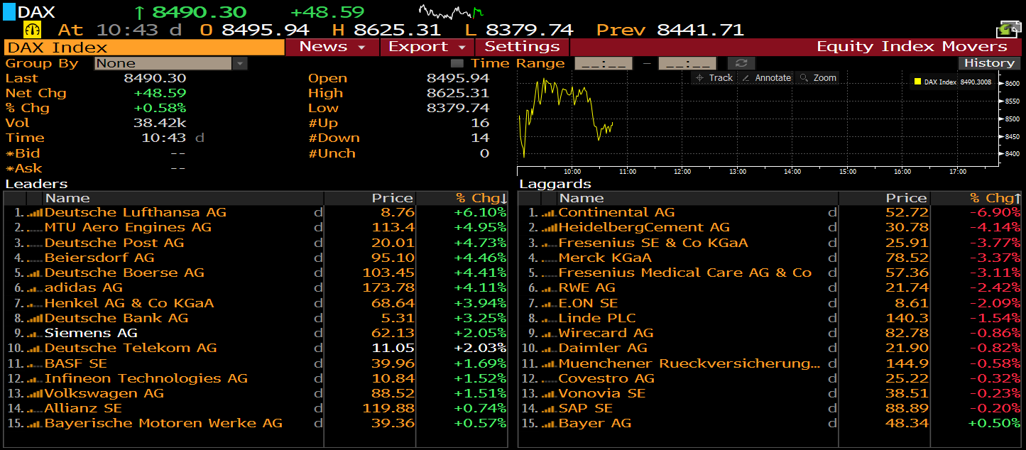 Deutsche Lufthansa (LHA.DE) este astăzi cea mai performantă companie din componența DAX. Compania beneficiază de îmbunătățirea generală a sentimentului. Totodată, știrile interne ale companiei nu sunt foarte pozitive. Transportatorul german va menține la sol 700 de avioane și va reduce numărur zborurilor cu 95%. Compania a mai transmis că industria aeriană nu poate supraviețui fără ajutorul statului.