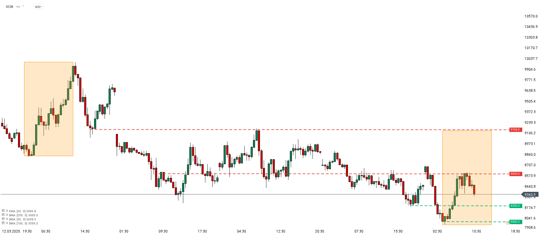 DE30 continuă să se bucure de mișcări volatile. Indicele a marcat un nou minim peste noapte, testatând nivelul de 8.000 de puncte. Cu toate acestea, indicele german a reușit să recupereze aproximativ 500 de puncte până la începutul sesiunii europene. Rezistența se conturează la 8.600 puncte și putem observa o scădere la momentul publicării articolului. Cel mai apropiat suport de urmărit este la 8.200 de puncte, minimul după-amiezii de ieri. Nivelul menționat anterior de 8.000 de puncte este suportul final de urmarit. În partea superioară, cumpărătorii ar trebui să urmărească evoluția la rezistența de 8.600 puncte. Nivelul de 9.150 de puncte este limita superioară a structurii Overbalance și rezistența finală pentru moment.