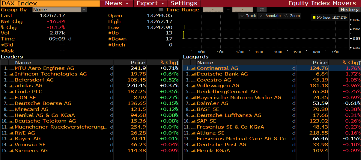 Performanța membrilor DAX la scurt timp după deschiderea sesiunii de miercuri. Sursa: Bloomberg