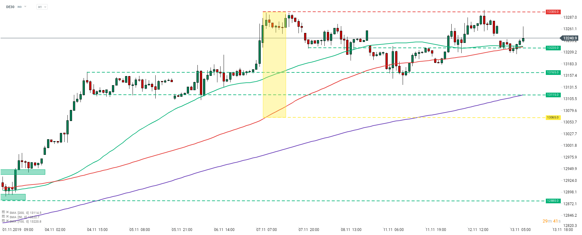 DE30 a găsit suport sub forma mediei mobile de 50 de ore (linia verde) la începutul sesiunii de ieri. Mișcarea ascendentă care a urmat a împins cotația către un nou maxim anual. Cu toate acestea, indicele nu a rămas acolo pentru mult timp, iar o retragere a început seara. DE30 a testat din nou media mobilă de 50 de ore astăzi și a reușit din nou să avanseze. Rvenirea a avut loc la nivelul de inversare pe termen scurt de la 13220 de puncte. Indicele german a crescut la începutul sesiunii cash de astăzi, în încercarea de a acoperi gap-ul descendent al prețurilor, dar fără să aibă succes. Nivelul de rezistență de urmărit este același: limita superioară a structurii Overbalance de la 13300 de puncte. Pragul de la 13220 de puncte ar trebui să servească drept un suport pe termen scurt, fiind susținut de mediile mobile de 50 și 100 de ore.