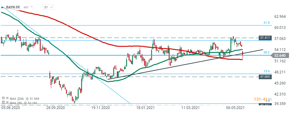 Acțiunile Bayer (BAYN.DE) au lansat sesiunea de astăzi cu un gap negativ. Vânzătorii au reușit să împingă prețul sub retragerea Fibonacci de 38,2% a ultimului val descendent și sub linia ascendentă de trend, totuși declinurile au fost oprite la media mobilă de 200 de perioade (linia roșie). Cel mai apropiat suport este la 47,00 EUR, în timp ce rezistența poate fi găsită în jurul nivelului de 57,41 EUR. Sursa: xStation5