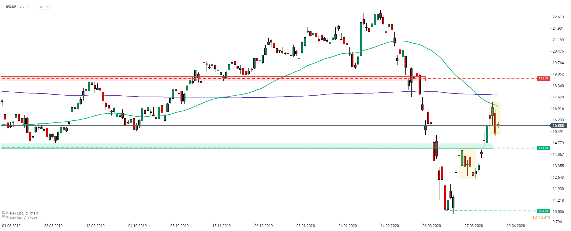 Infineon (IFX.DE) se tranzacționează în creștere astăzi, datorită unei prognoze solide pentru Q2 din partea TSMC. Acțiunea a reușit să oprească declinul de ieri în apropierea limitei inferioare a unei geometrii locale de piață, astfel, piața s-ar putea pregăti pentru o nouă mișcare ascendentă. Prima țintă de urmărit este media mobilă de 50 de perioade, cea care a oprit ultima mișcare de creștere (linia verde, zona de 17 €). Sursa: xStation5