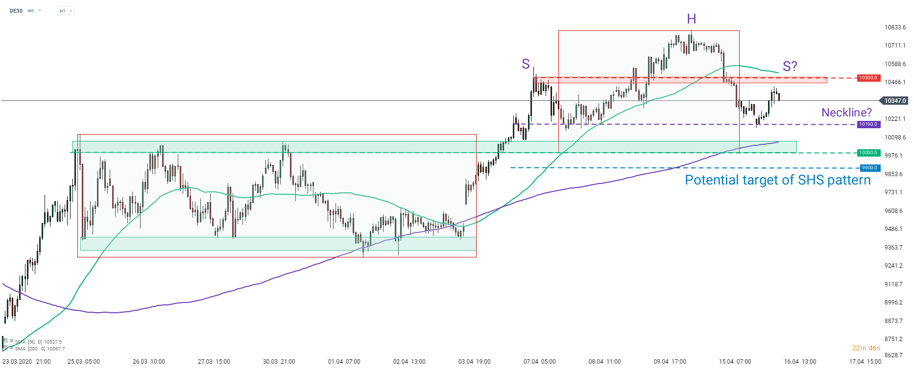 DE30 rămâne în interiorul unei structuri Overbalance ample (zona roșie). Indicele a scăzut în timpul nopții sub 10200 de puncte, dar ulterior a început să recupereze. Indicele a suferit o inversare înainte de a atinge rezistența de la 10500 de puncte. Cu toate acestea, în cazul în care indicele ar recâștiga terenul pierdut și ar accelera spre 10500 de puncte, cumpărătorii ar trebui să fie în gardă. O potențială formațiunea Head and Shoulders poate fi reperată pe graficul DE30, cu nivelul de 10190 de puncte servind ca suport. În cazul în care cel de-al doilea ”umăr” este trasat pe grafic, poate urma o alunecare către 9900 de puncte. Realizarea țintei potențiale a acestui model ar presupune spargerea suportului cheie de la 10000 de puncte - o situație în care perspectiva pe termen scurt ar putea deveni descendentă.