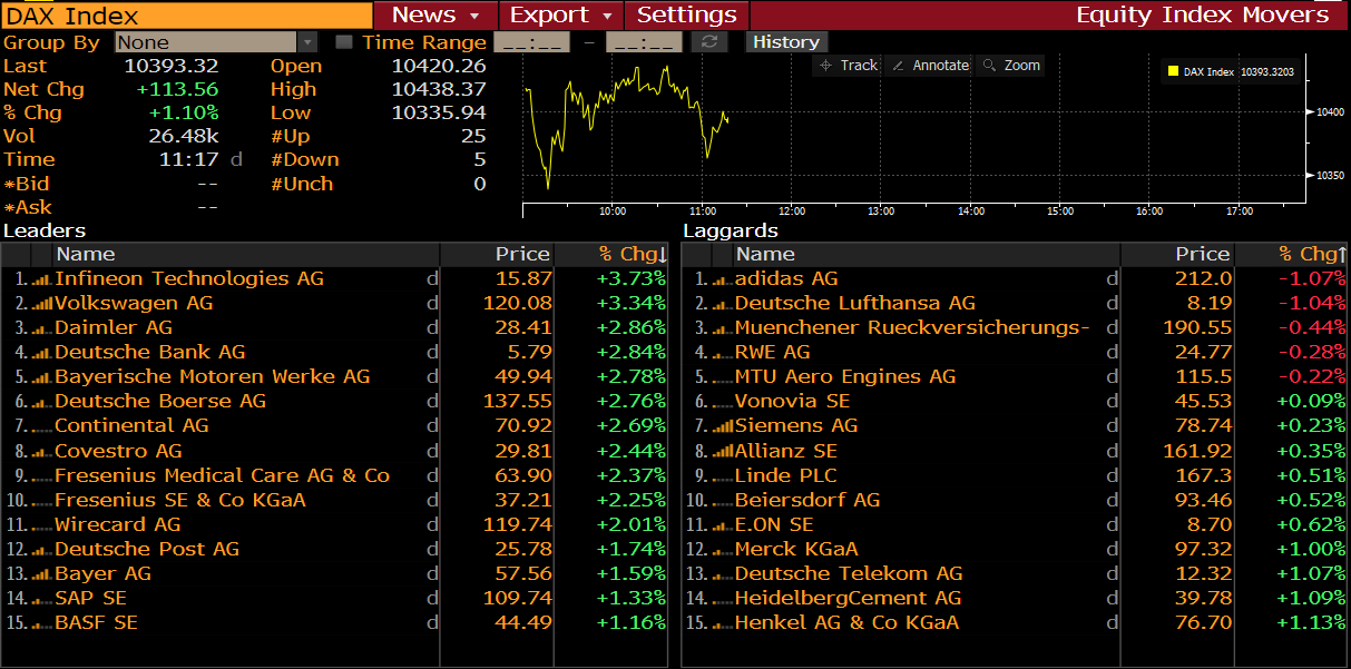 Acțiunile DAX la 12:17 pm ora României. Sursa: Bloomberg