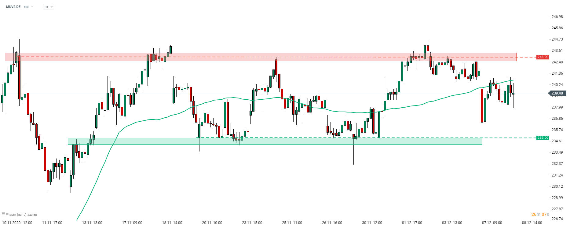 Munich Re (MUV2.DE) se depreciază în ciuda faptului că a prezentat obiective ambițioase până în 2025. Prețul acțiunilor se retrage de la media mobilă de 50 de ore (linia verde) și se îndreaptă spre limita inferioară intervalului recent de tranzacționare de la 235 EUR. Sursa: xStation5