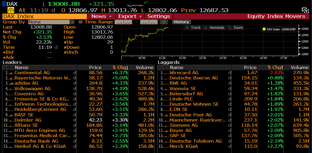 Membrii DAX la 12:19 pm ora României. Sursa: Bloomberg