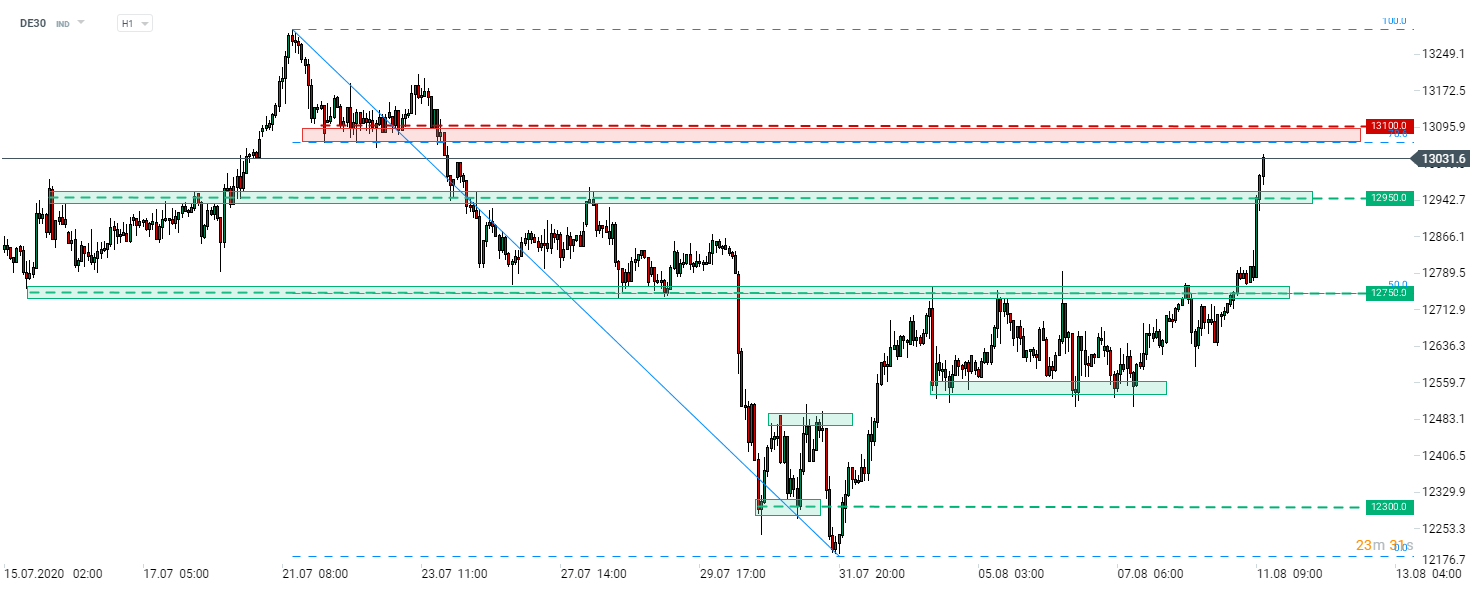 DE30 a reușit în sfârșit să depășească rezistența de la 12750 de puncte, nivel marcat de retragerea Fibonacci de 50% din scăderea de la sfârșitul lunii iulie. Indicele german a urcat în această dimineață deasupra nivelului de 13000 de puncte pentru prima dată începând cu 24 iulie. Rezistența pe termen scurt de urmărit se află în zona delimitată de retragerea Fibonacci de 78%, 13065 de puncte și nivelul cheie de la 13000 de puncte. Cu toate acestea, investitorii ar trebui să țină cont de faptul că avansurile de astăzi au fost foarte rapide și, există riscul unei corecții pe termen scurt. Sursa: xStation5