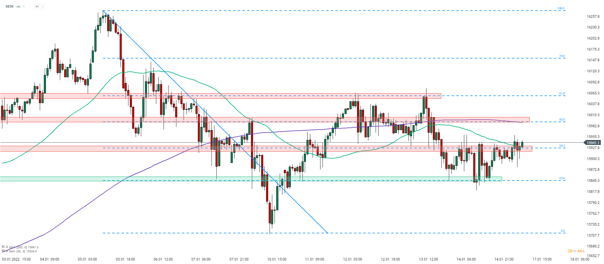 DE30 a avansat din nou deasupra zonei de rezistență situată în apropiere de 15.925 de puncte, zonă marcată cu media mobilă de 50 de ore (linia verde) și retragerea Fibonacci de 38,2% a mișcării descendente lansate pe 5 ianuarie 2022. Indicele revine după scăderea care a avut loc la sfârșitul săptămânii precedente. Cea mai apropiată rezistență de urmărit poate fi găsită deasupra retragerii Fibonacci de 50% situată în zona de 16.000 de puncte. Rețineți că media mobilă de 200 de ore (linia mov) se află și ea în această zonă. Deoarece calendarul macroeconomic și cel al raportărilor de astăzi sunt goale, sesiunea ar putea să nu aibă fluctuații mari de preț.