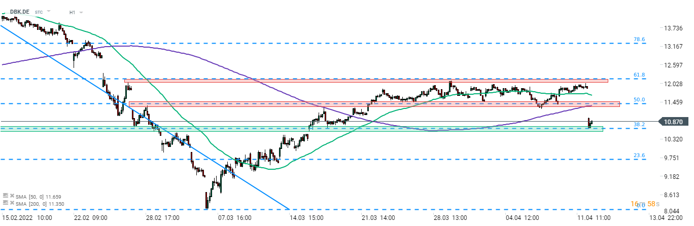 Acțiunile Deutsche Bank (DBK.DE) se tranzacționează cu aproape 9% în scădere la momentul publicării acestui articol. Acțiunile a deschis sesiunea de tranzacționare de astăzi cu un gap negativ iar prețul a continuat să scadă. Cumpărătorii au reușit să găsească suport în zona marcată de retragerea Fibonacci de 38,2% a mișcării descendente lansate la începutul lunii februarie. Zona de rezistență pe termen scurt de urmărit poate fi găsită în apropierea retragerii Fibonacci de 50% (zona de 11,40 EUR). Sursa: xStation5