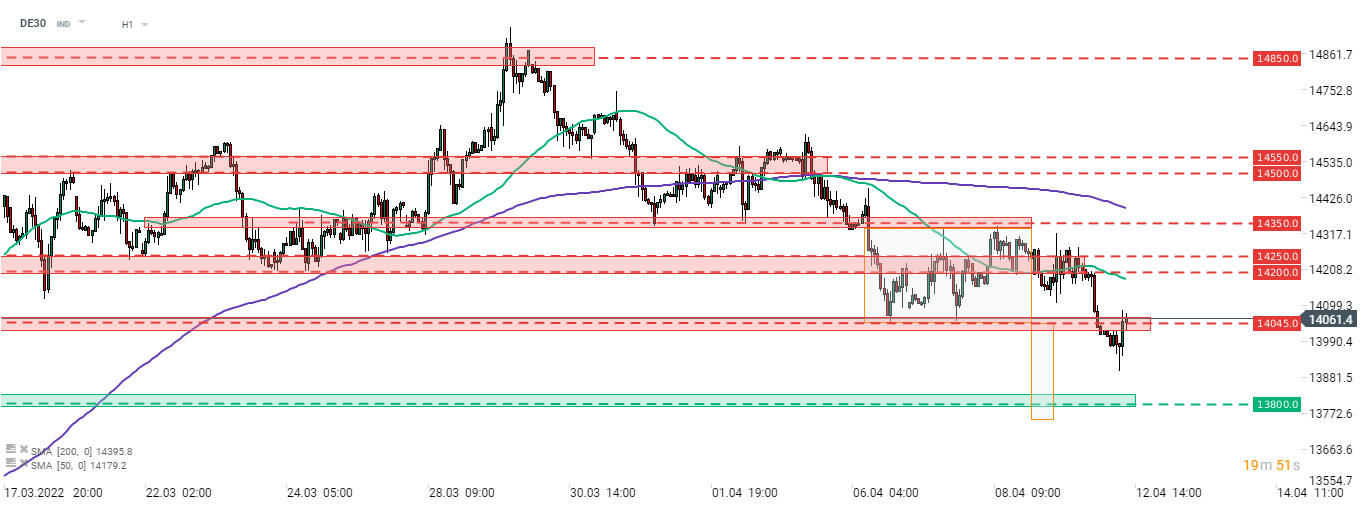 DE30 a depășit limita inferioară a intervalului de tranzacționare pe termen scurt, limită situată în zona de 14.045 puncte. Ulterior, indicele a testat zona de 13.900 de puncte, unde scăderile au fost oprite și a fost lansată mișcarea de recuperare. O încercare de a reveni peste nivelul de 14.045 de puncte menționat anterior poate fi observată în momentul publicării acestui articol. Cu toate acestea, dacă taurii nu reușesc să readucă prețul în intervalul menționat anterior și indicele continuă mișcarea descendentă, ar fi o retestare clasică în urma unei spargeri și ar putea semnala că se pregătește o mișcare de scădere mai amplă. Într-un astfel de scenariu, investitorii ar trebui să se concentreze pe zona de 13.800 de puncte ca următor potențial suport. Ținta teoretică a ieșirii din intervalul de tranzacționare menționat este marcată cu caseta portocalie și poate fi găsită puțin sub acest nivel de suport.