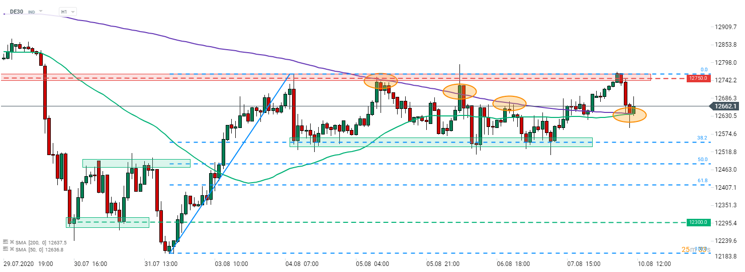 DE30 a câștigat în timpul sesiunii asiatice și a reușit să testeze zona de rezistență de la 12750 de puncte. Cu toate acestea, după o încercare eșuată, indicele s-a retras și a găsit suport la media mobilă de 200 de perioade (linia violet). Pe de altă parte, o formațiune de tip Double Bottom a fost desenată în zona de 12650 de puncte și DE30 pare să se angajeze pentru un alt atac al rezistenței menționate de la 12750 de puncte. Sursa: xStation5